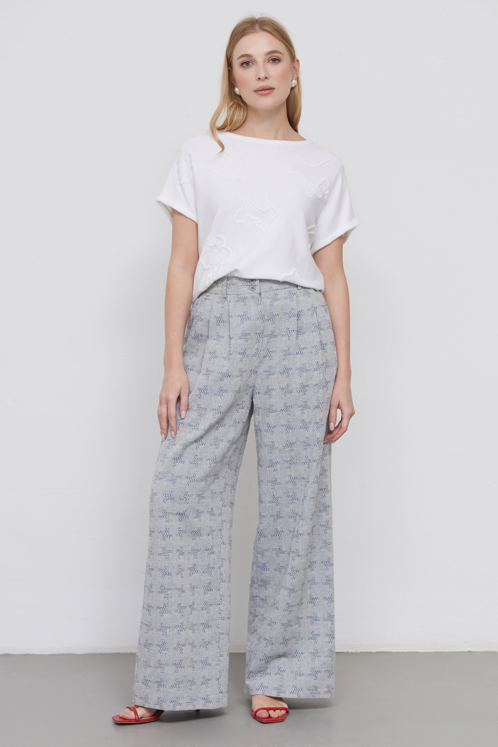 Брюки-палаццо из хлопка и льна с защипами и рисунком.