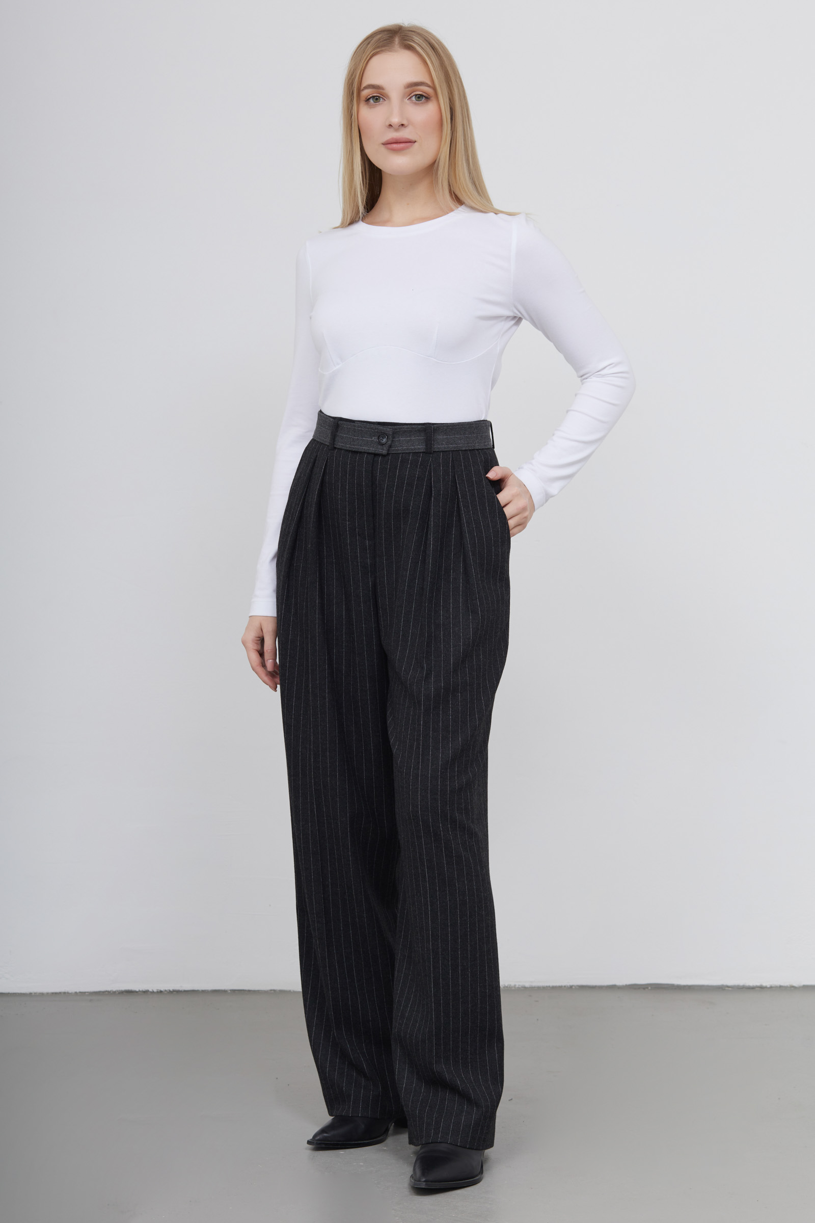 Широкие костюмные брюки в полоску из смесовой шерсти с контрастным поясом и складками.