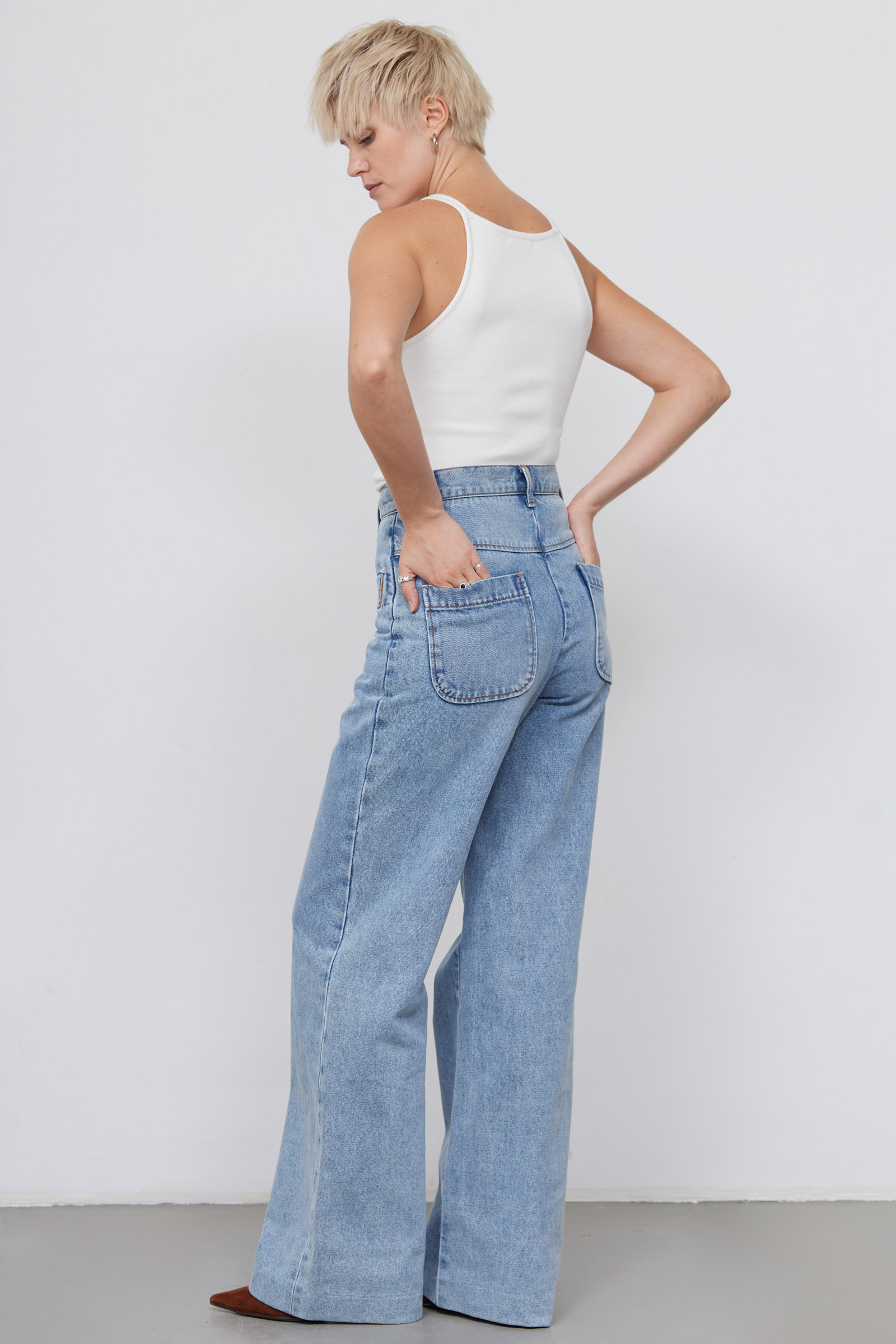 Широкие джинсы из плотного денима с акцентными карманами и открытой молнией.