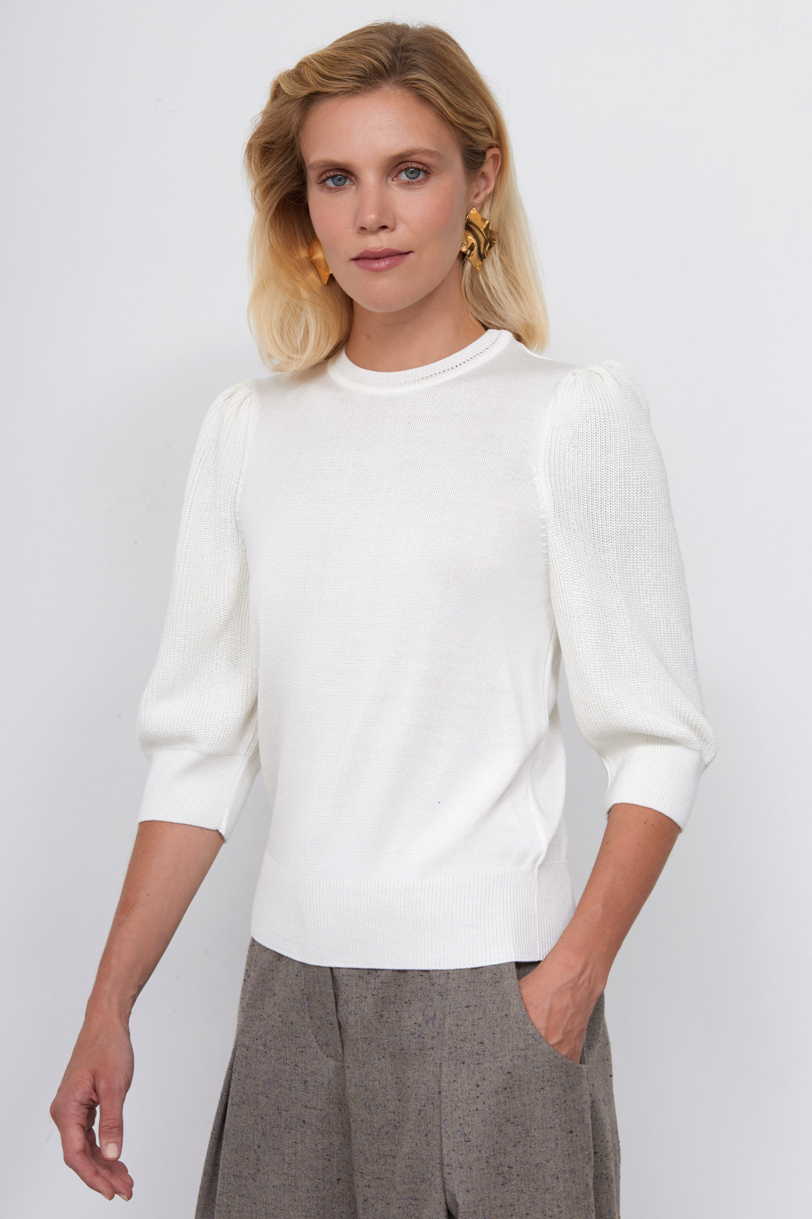 Джемпер из вязаного вискозного трикотажа с пышными рукавами.