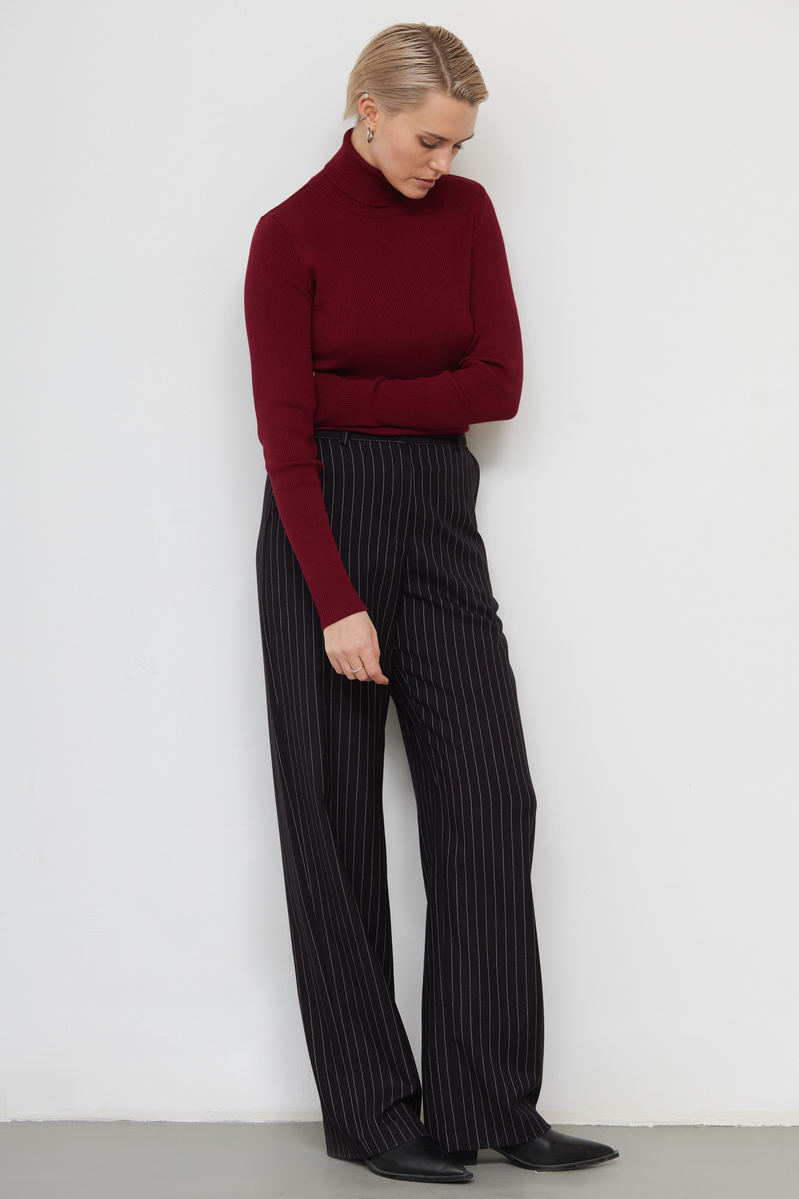 Базовая водолазка из мягкого вискозного трикотажа в рубчик.