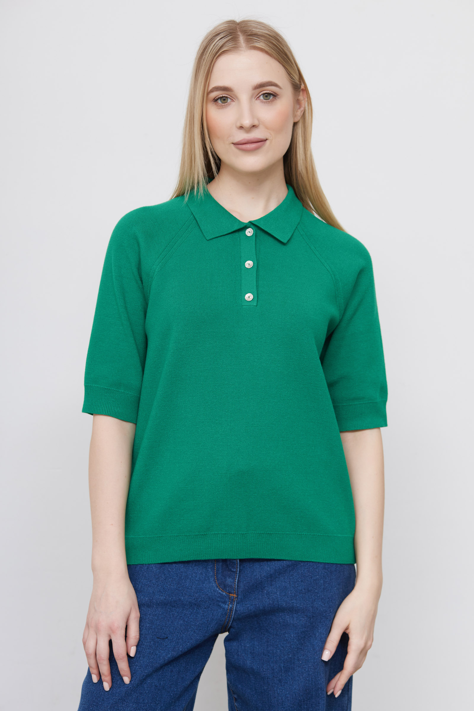 Джемпер-поло из мягкого вязаного трикотажа с короткими рукавами.