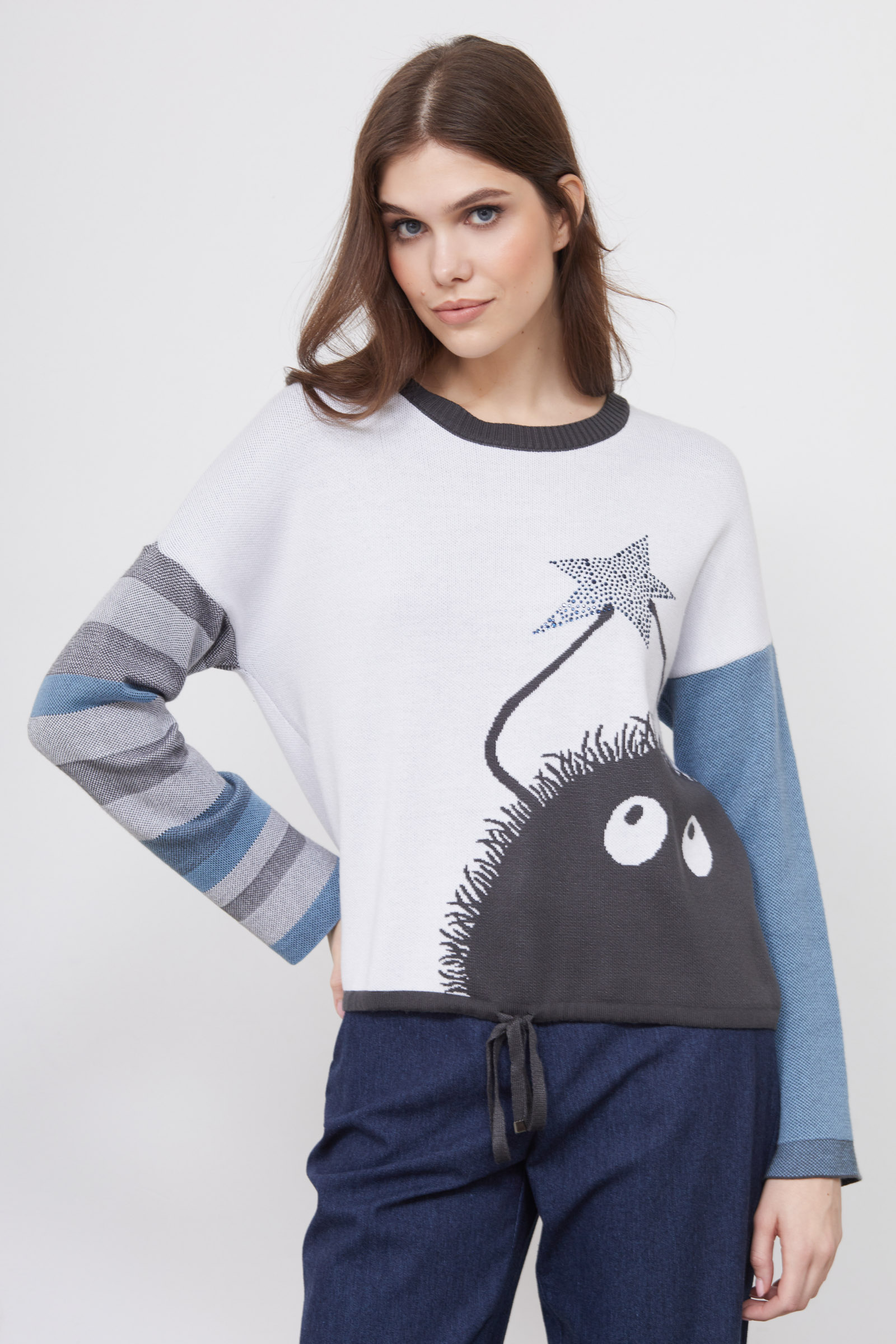 Джемпер жаккардовой вязки с фантазийным рисунком и декором из страз.