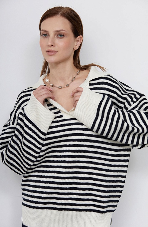 Джемпер поло oversize из полушерстяного вязаного трикотажа в полоску.