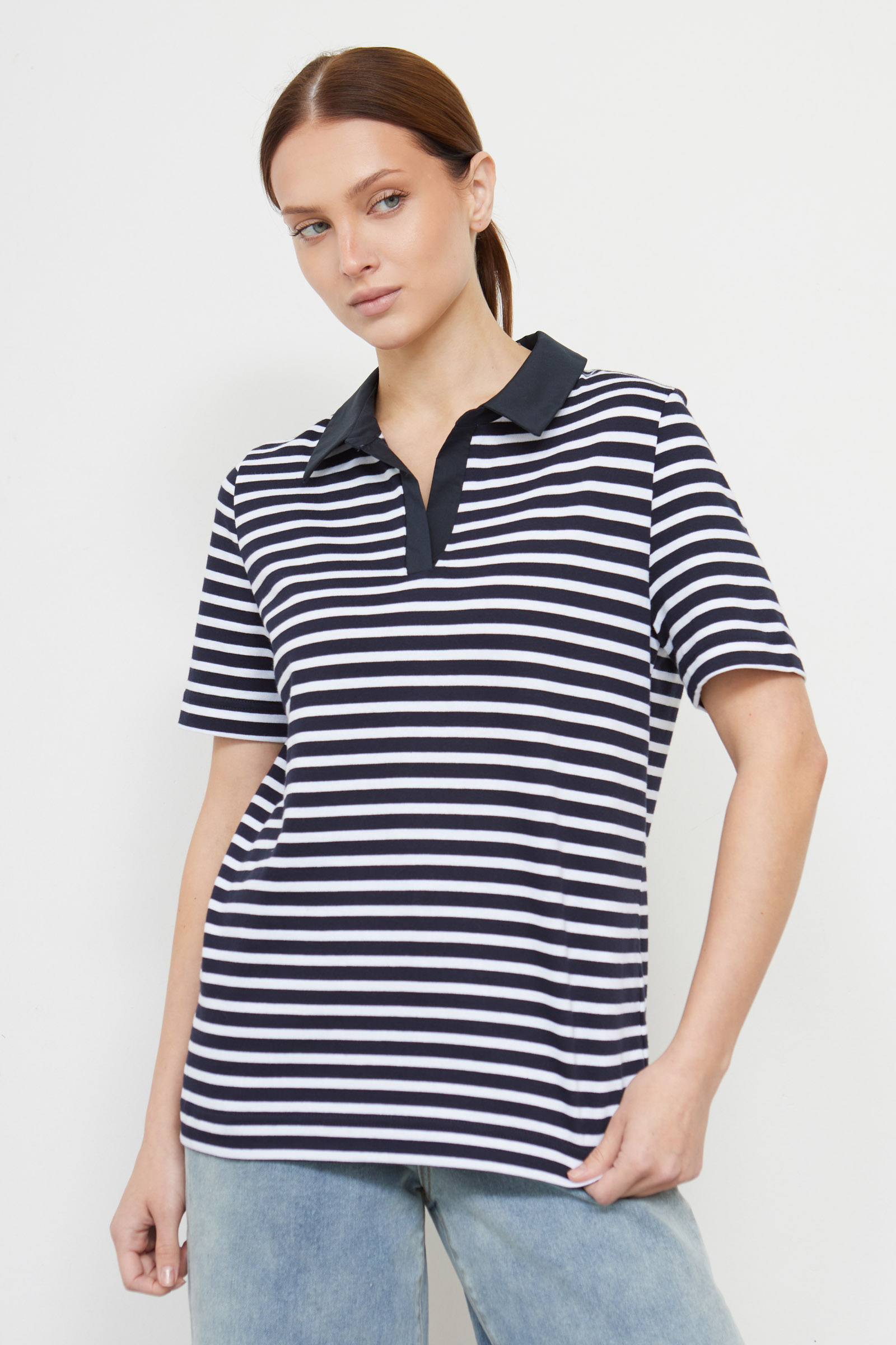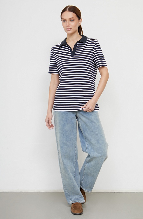 Футболка поло из мягкого хлопкового трикотажа в полоску с контрастным воротником.