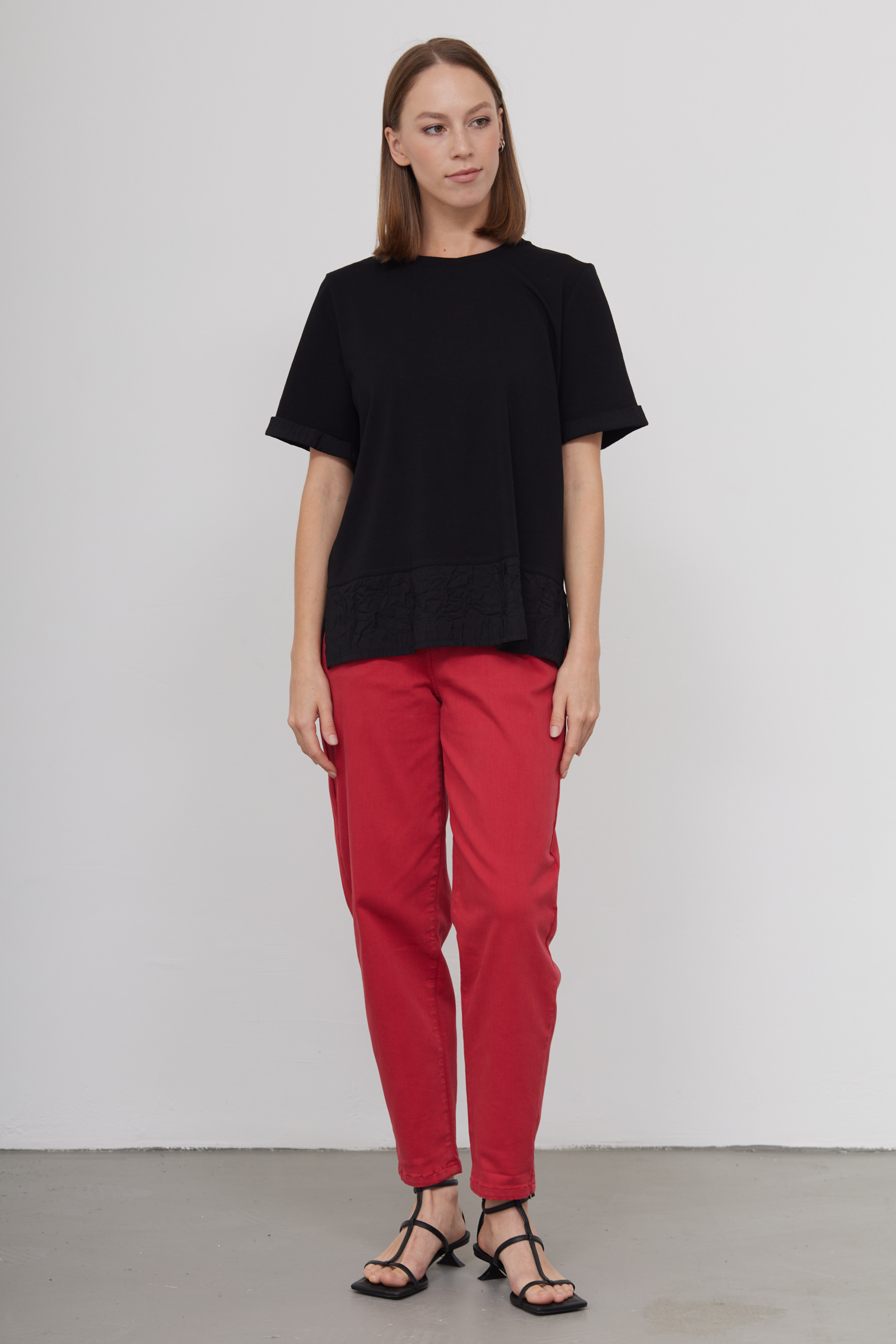 Комбинированная футболка oversize из мягкого хлопкового трикотажа с деталями из жатой вискозы.