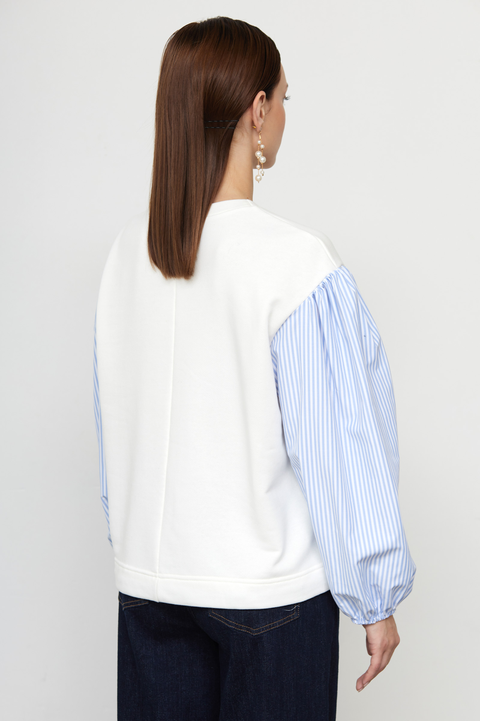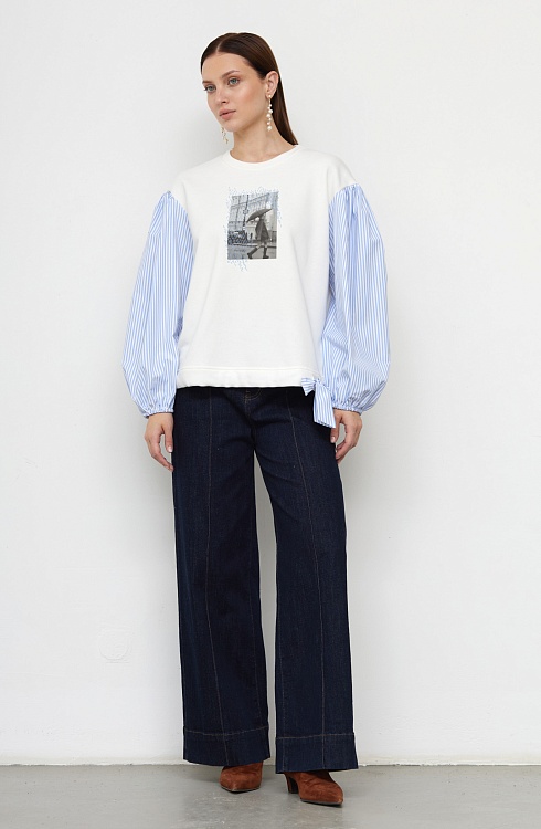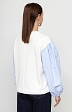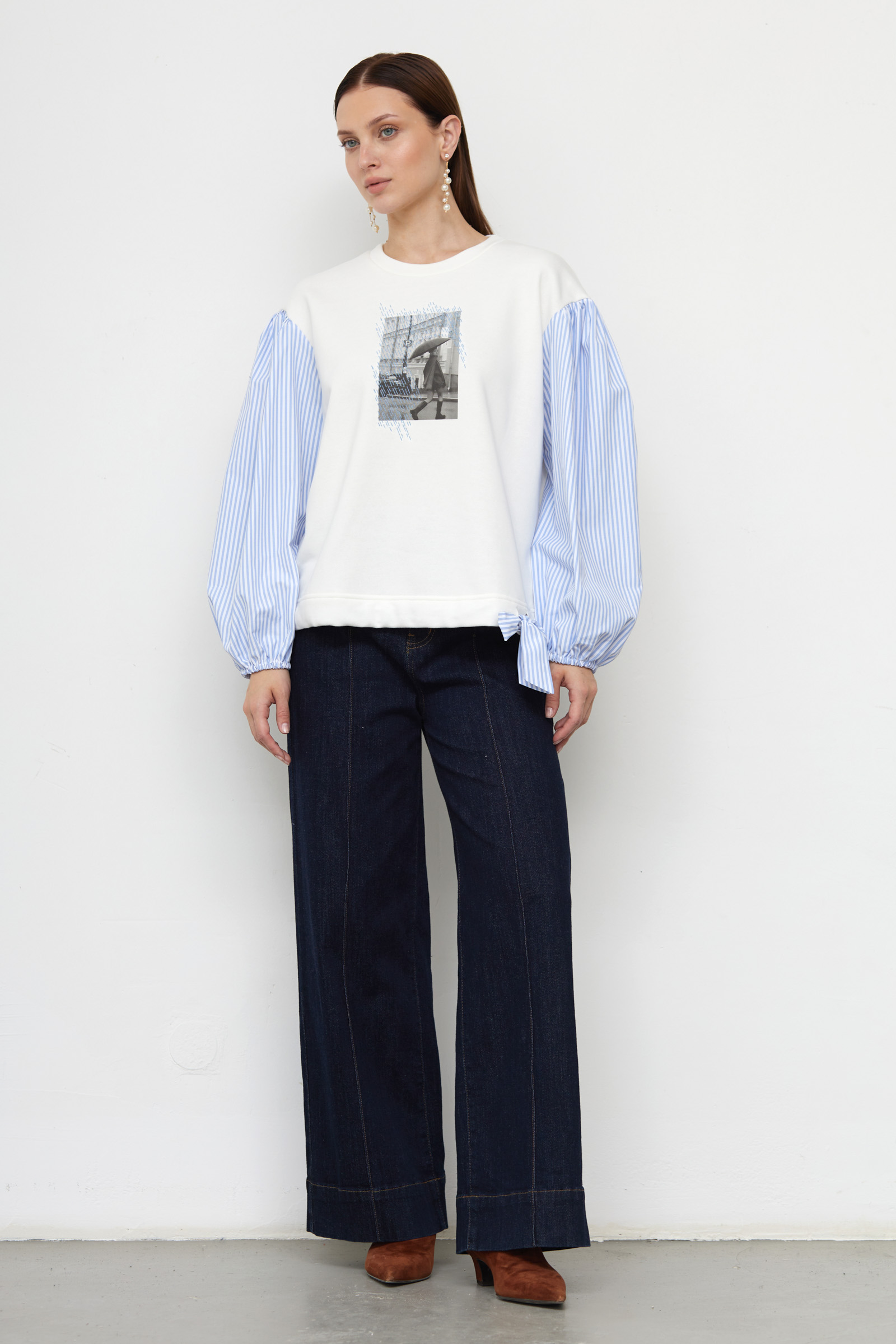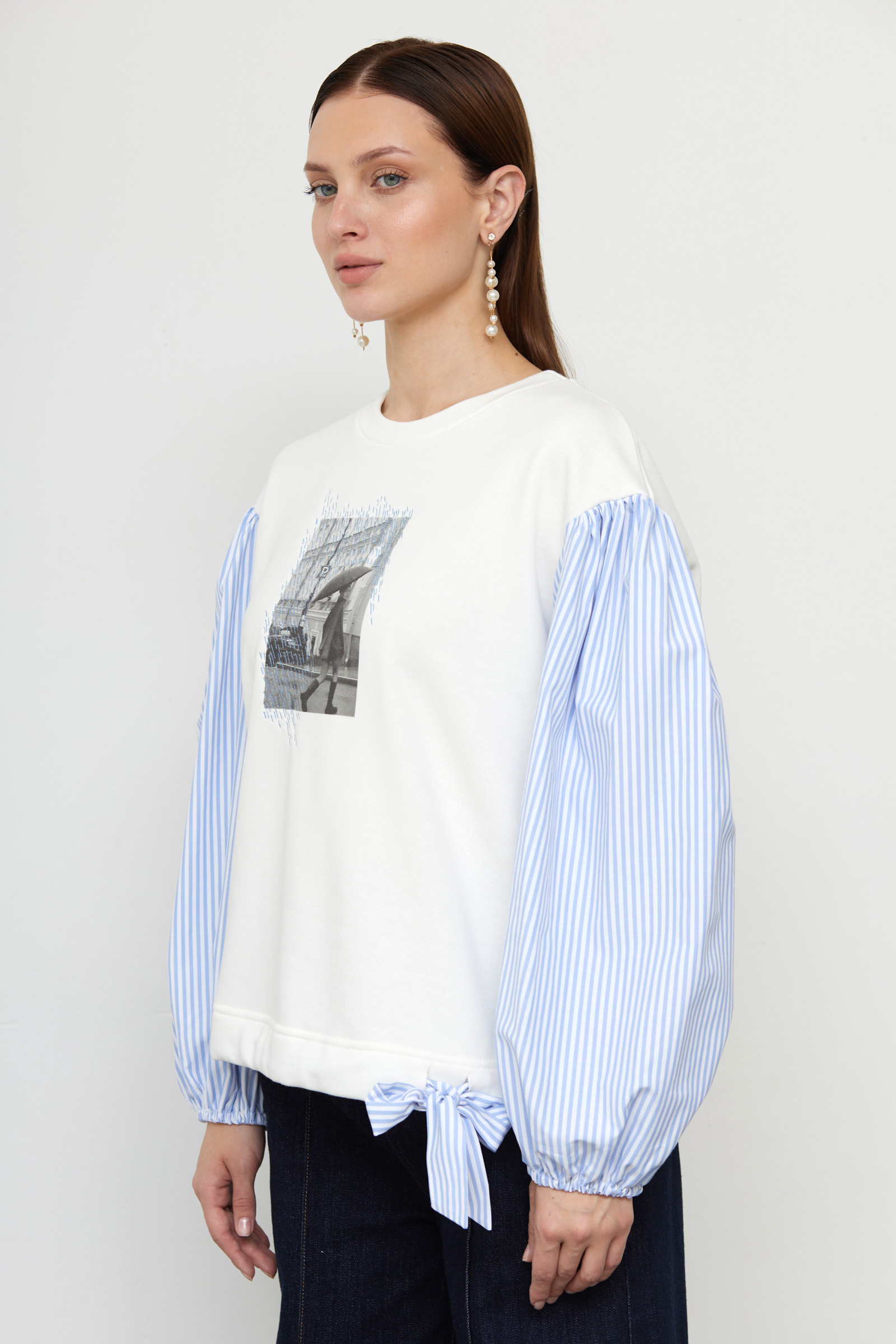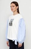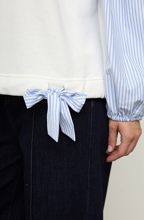 Комбинированный свитшот из футера с рукавами буфами из хлопка в полоску, печатным принтом с вышивкой и завязками по низу.