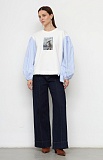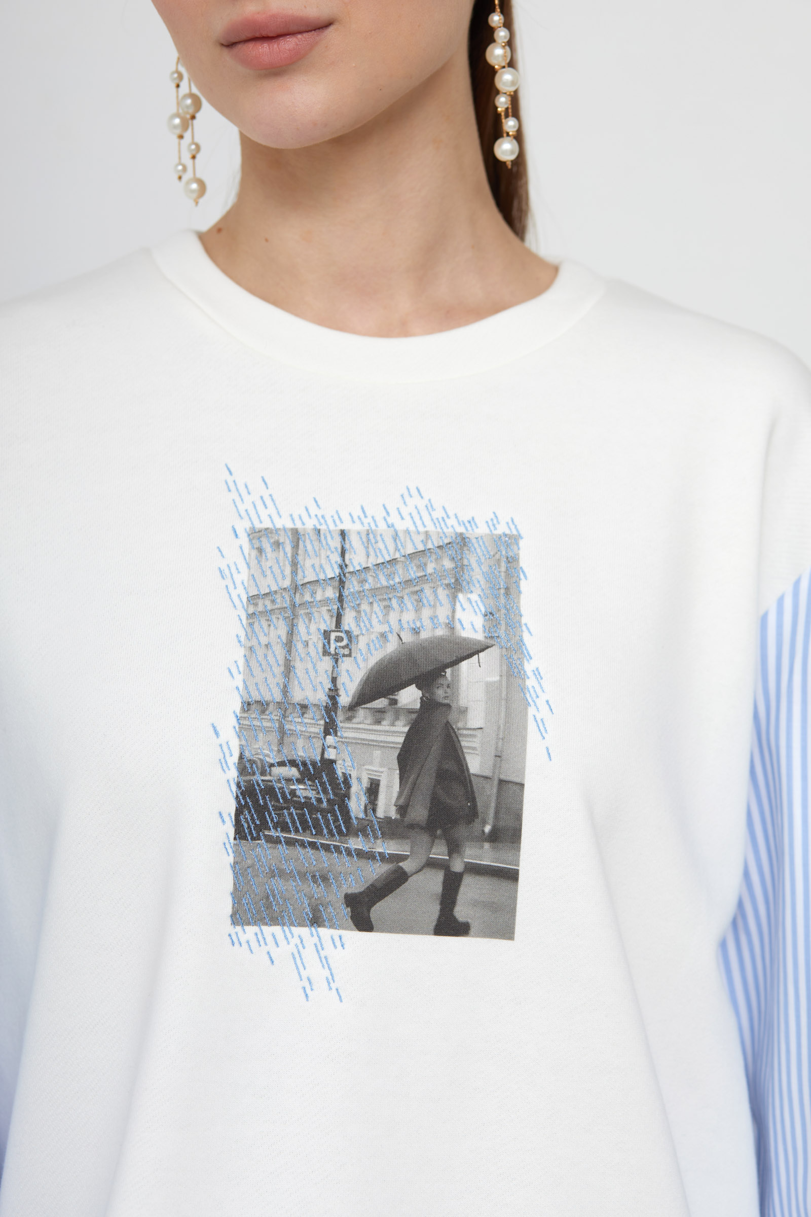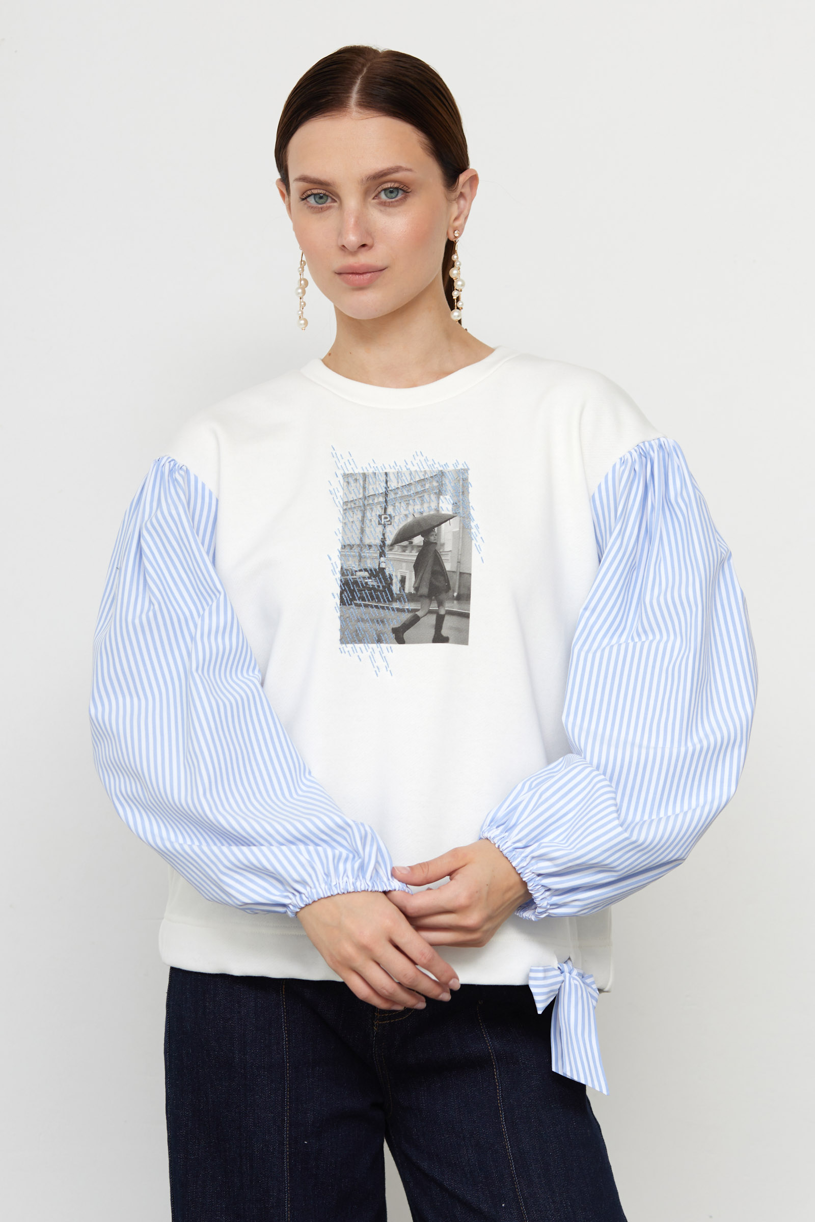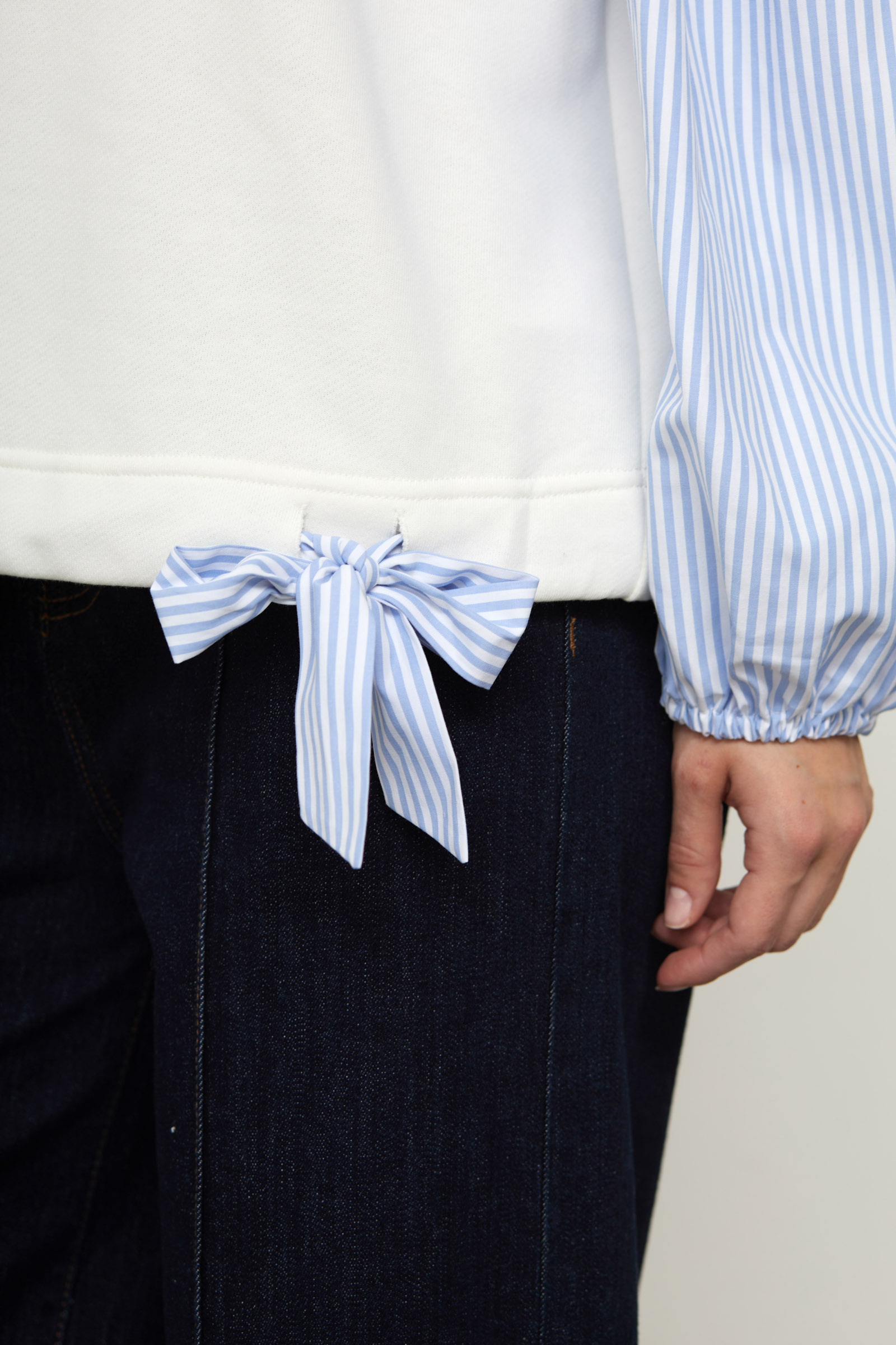 Комбинированный свитшот из футера с рукавами буфами из хлопка в полоску, печатным принтом с вышивкой и завязками по низу.