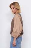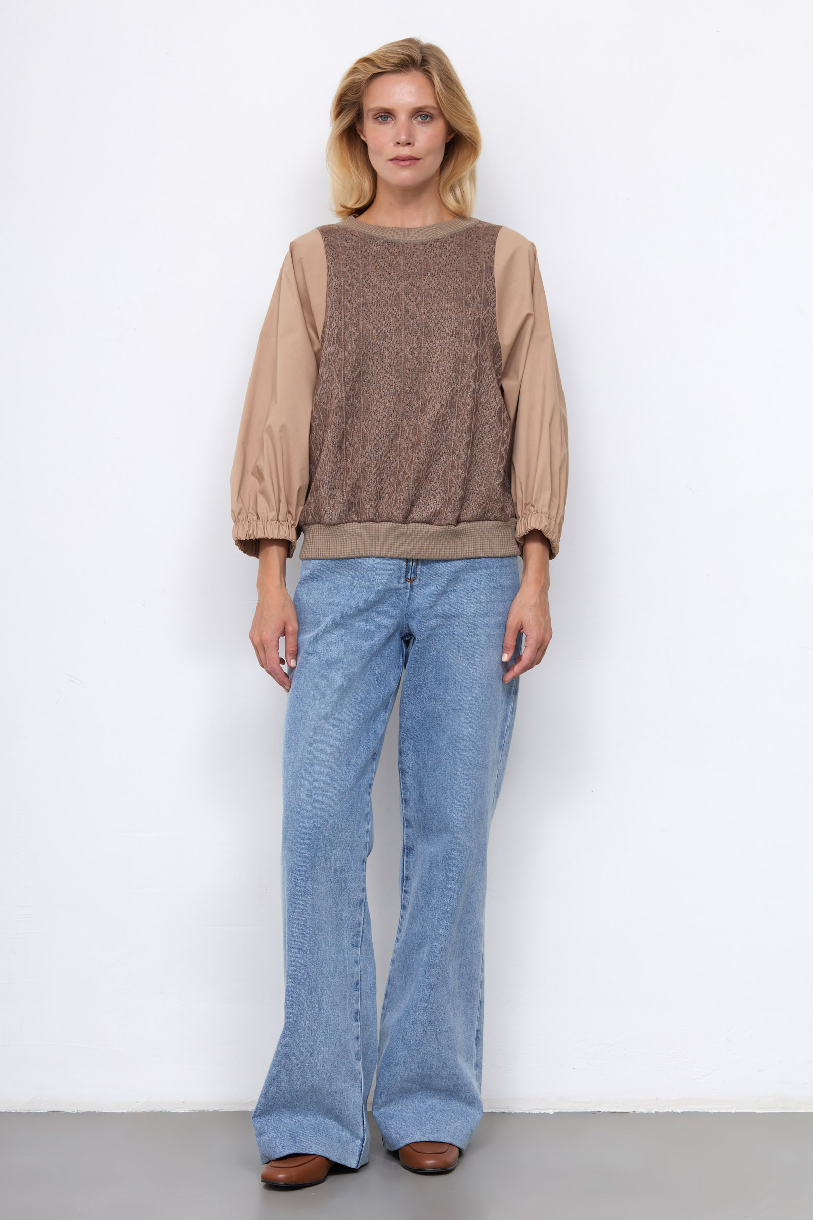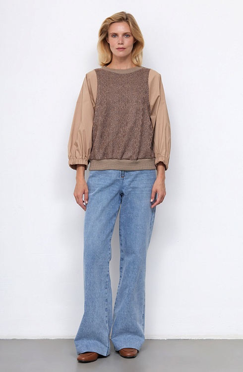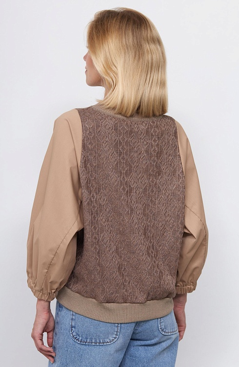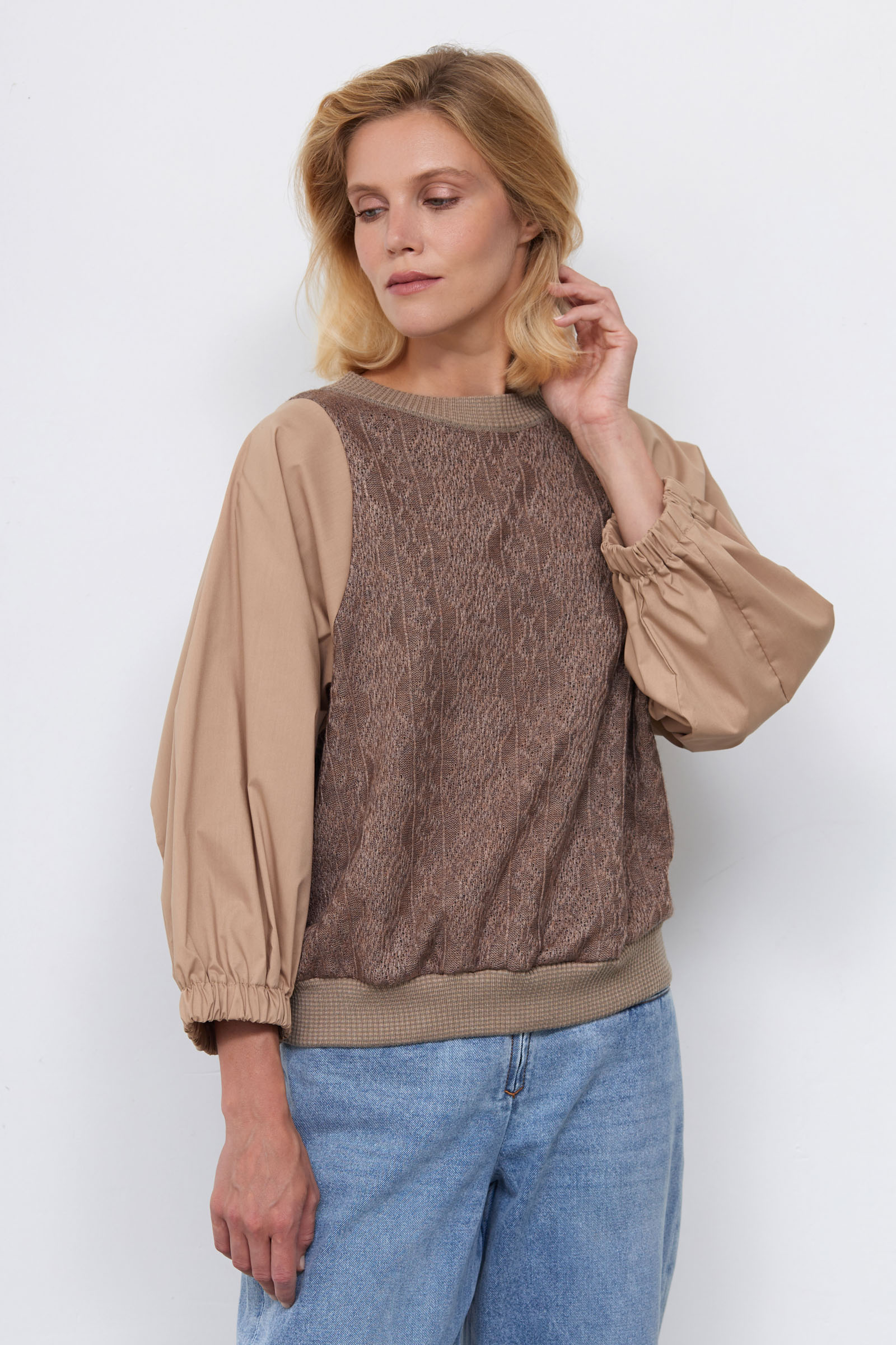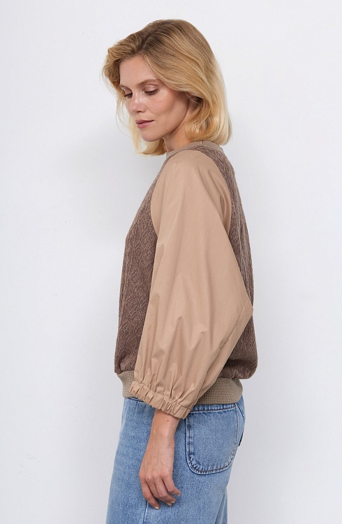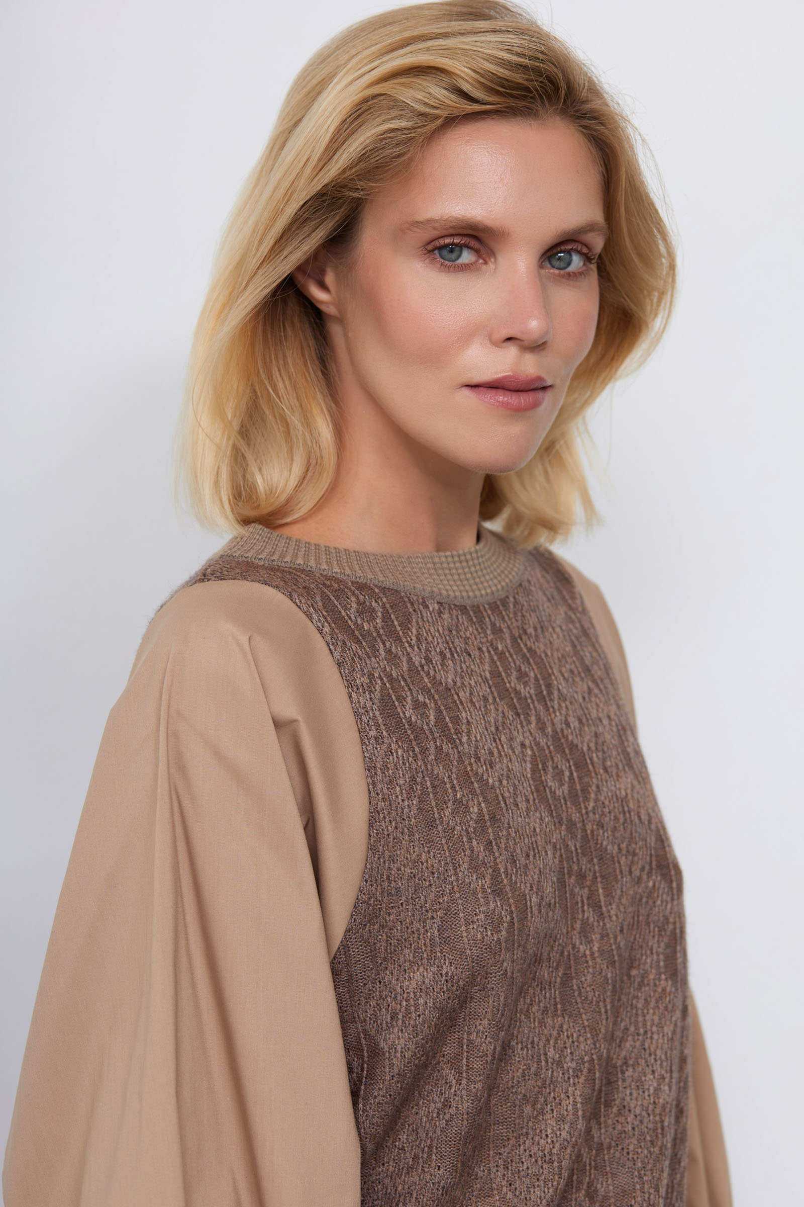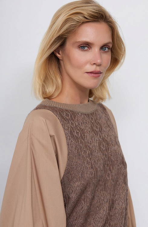 Комбинированный джемпер из мягкого вязаного трикотажа с узорами и пышными рукавами из поплина.