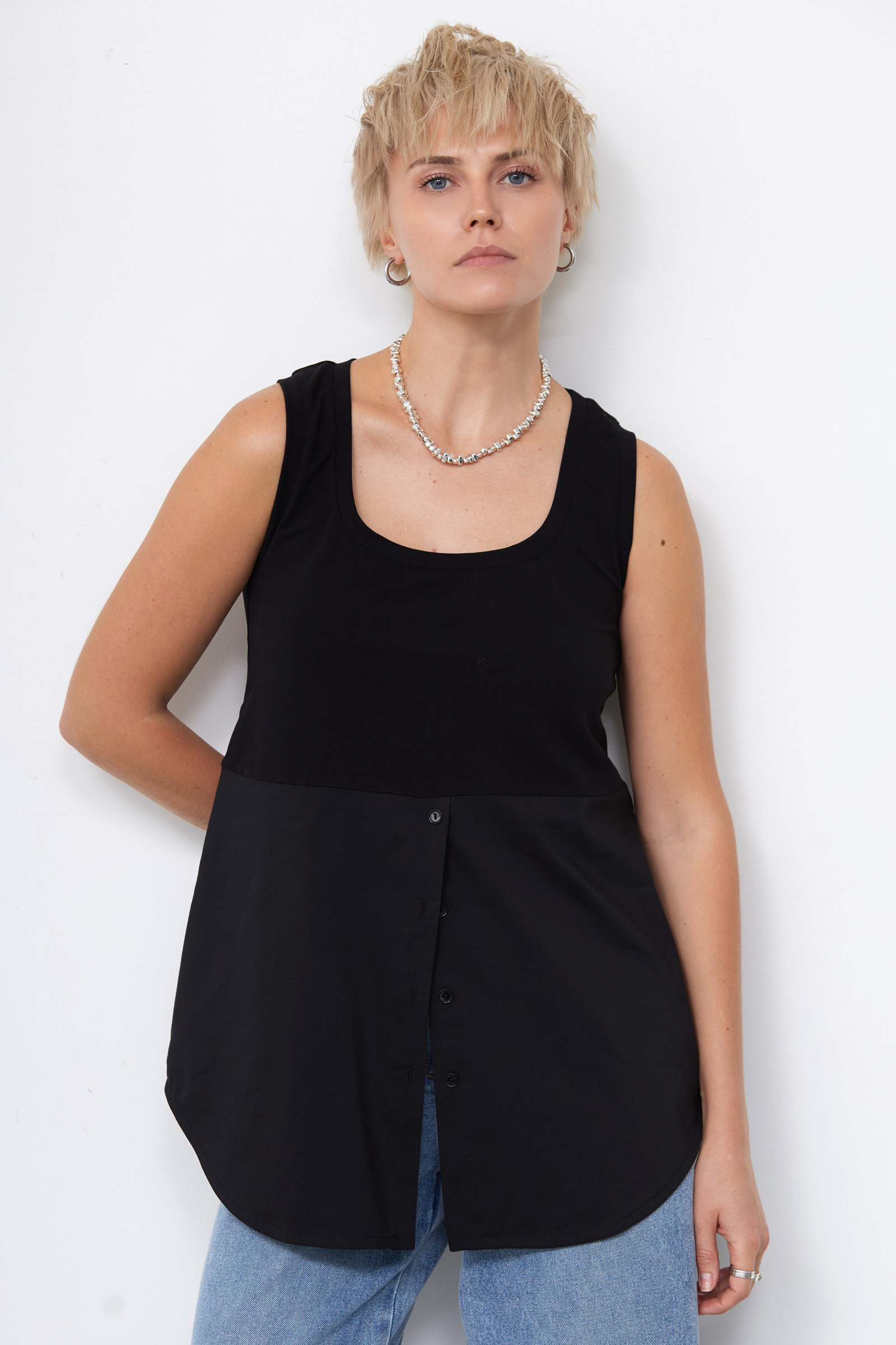 Комбинированный топ с верхней частью из хлопкового трикотажа и низом из гладкого хлопкового текстиля на пуговицах.