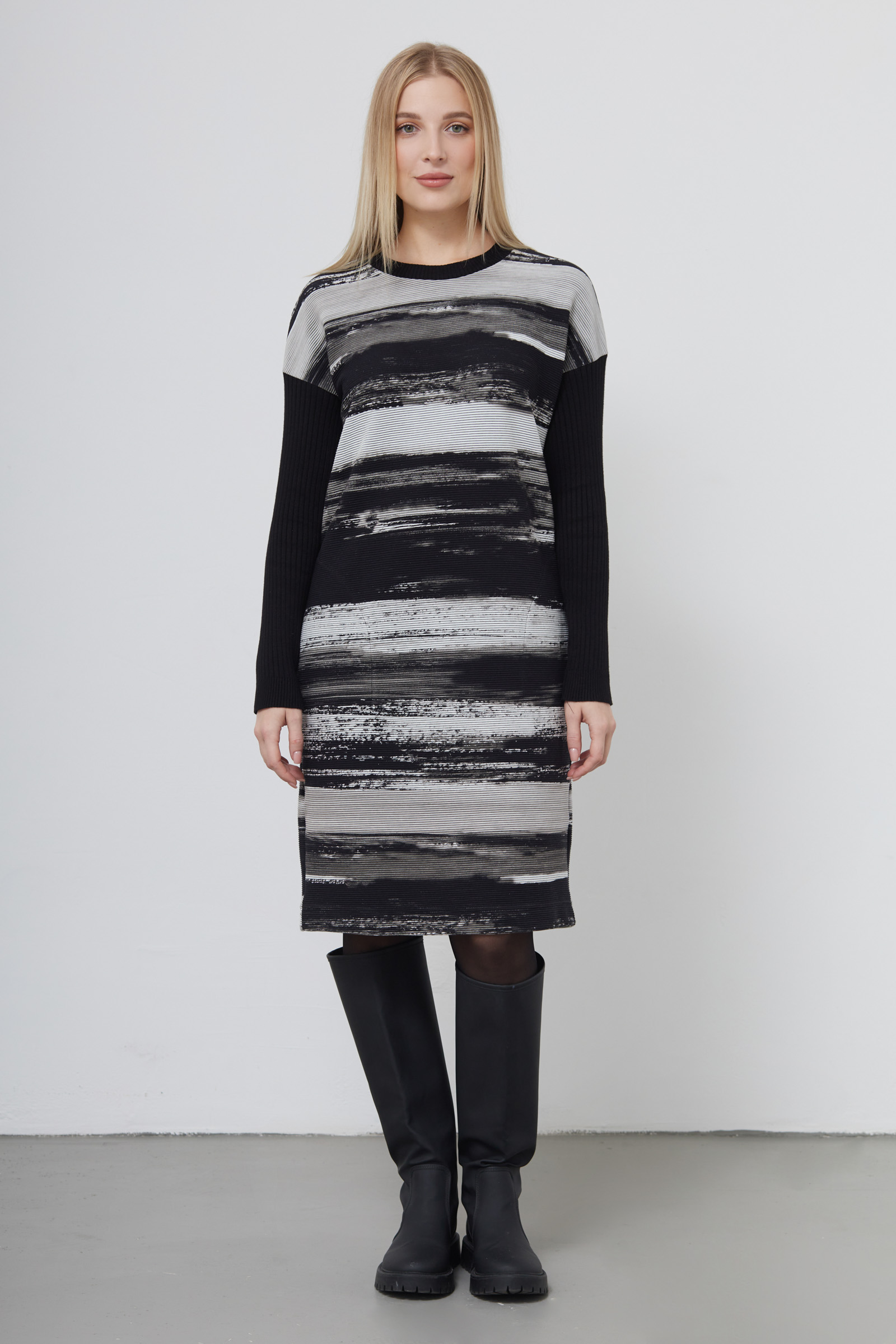 Платье oversize из фактурного трикотажа с вязаными рукавами.