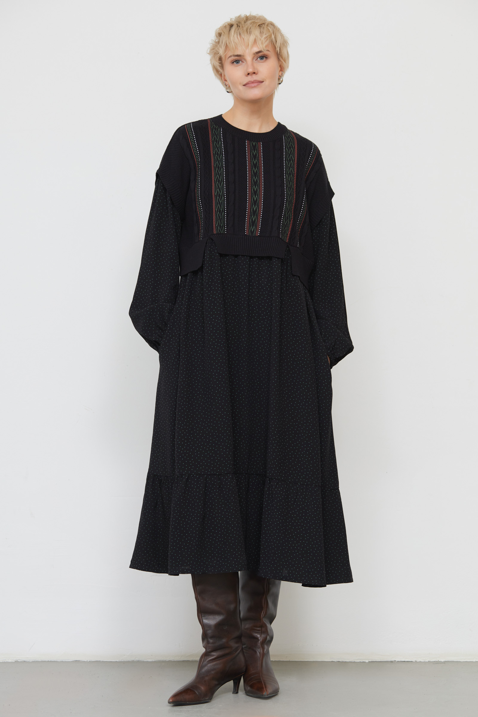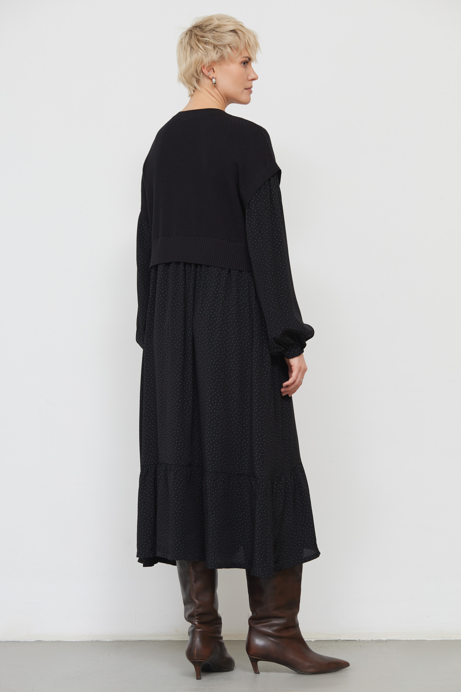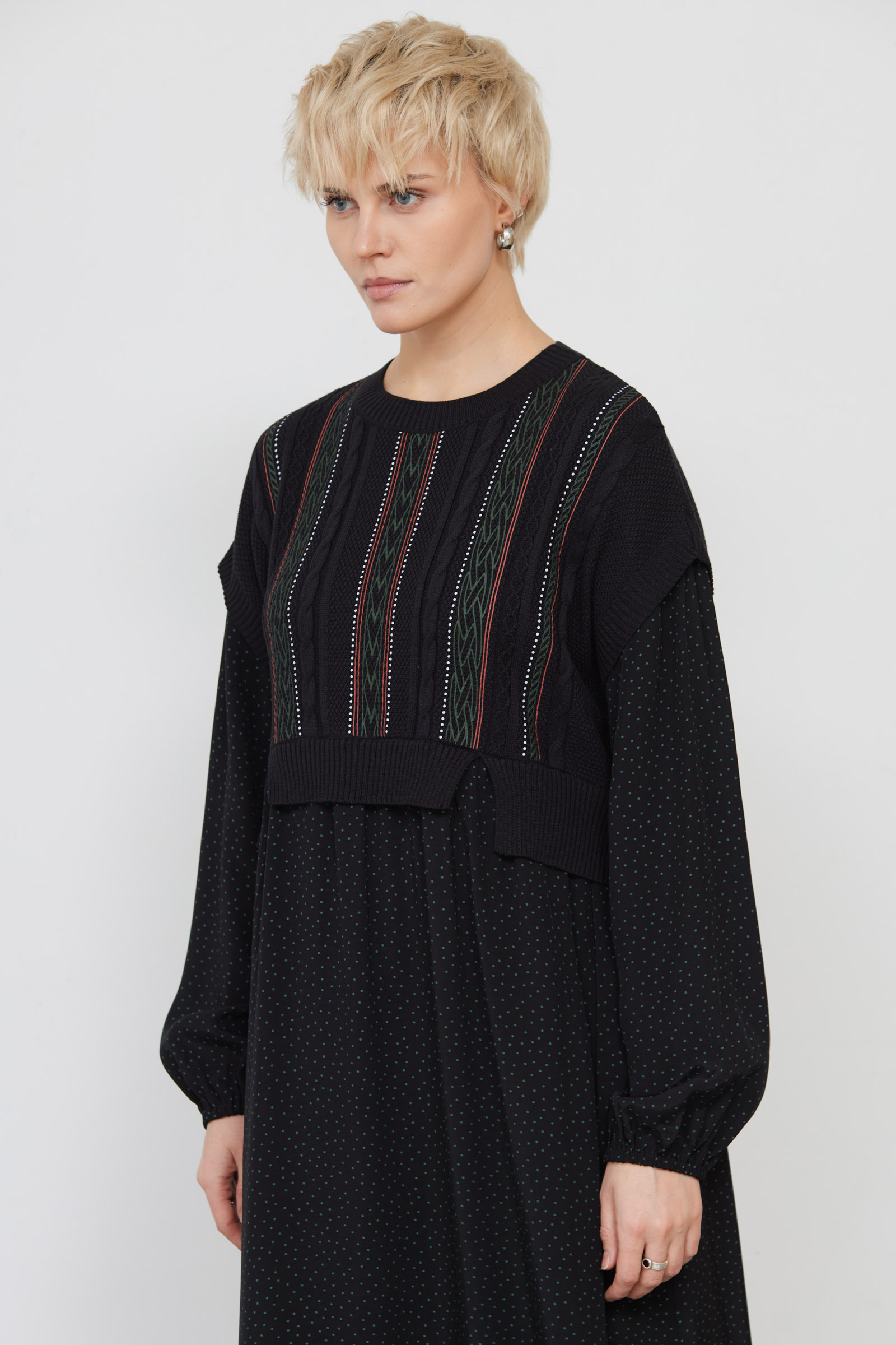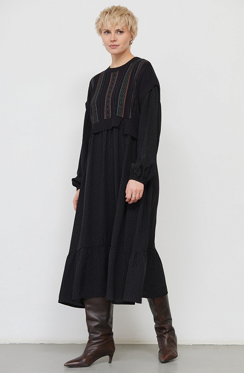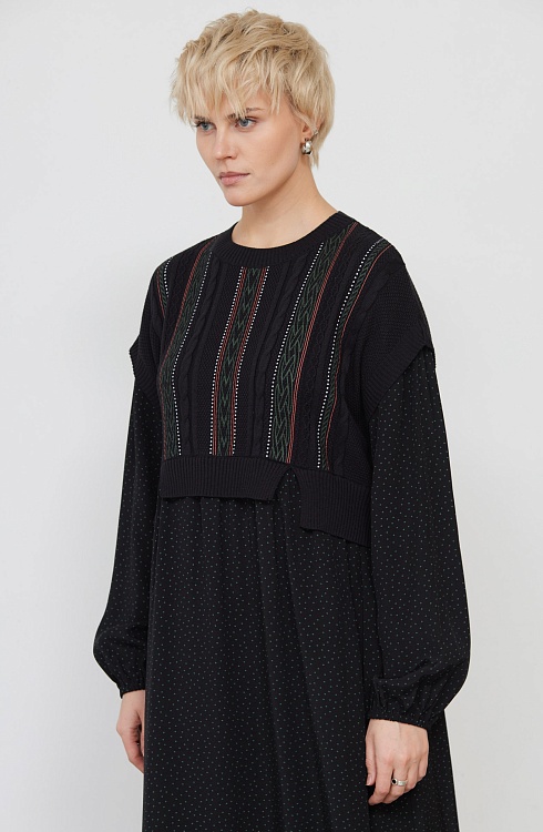Комбинированное платье с рукавами и юбкой из струящейся вискозы в горошек, и имитацией жилета с фактурным орнаментом.
