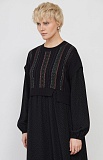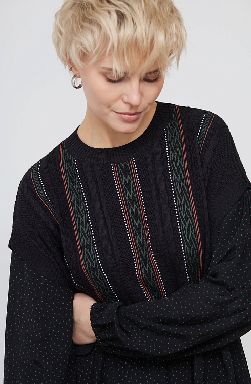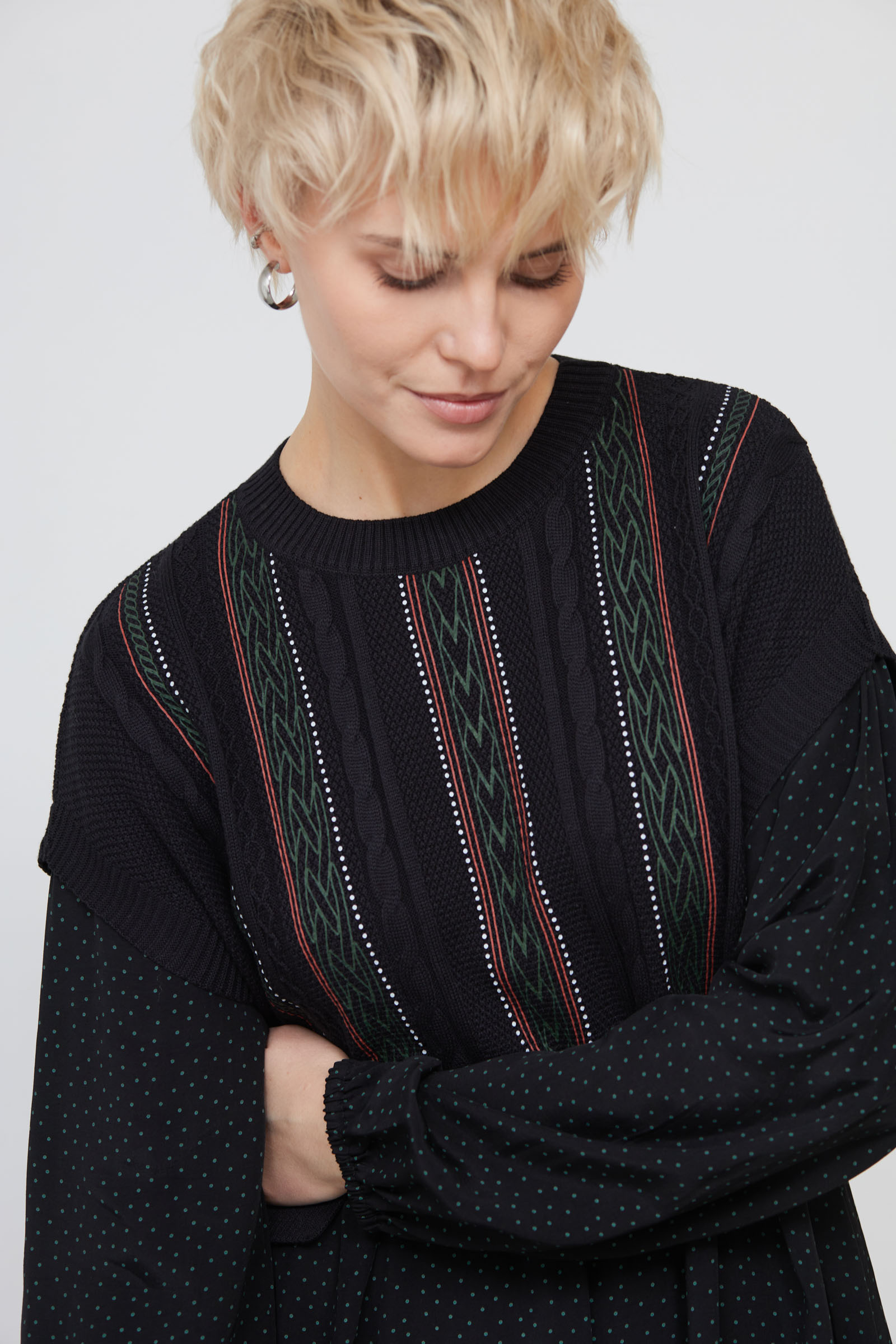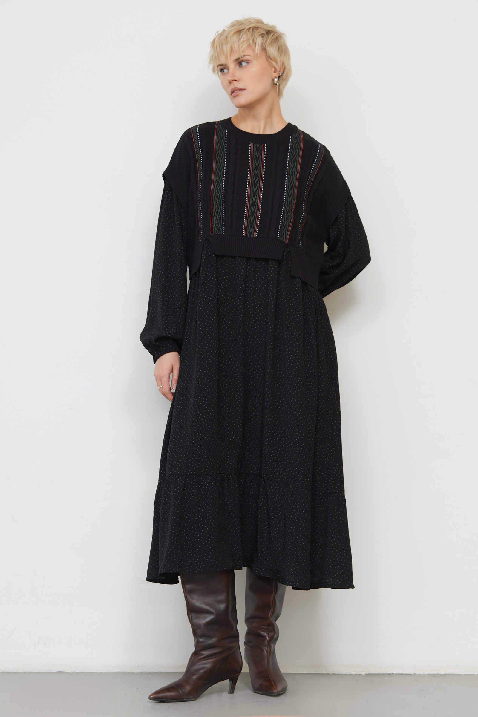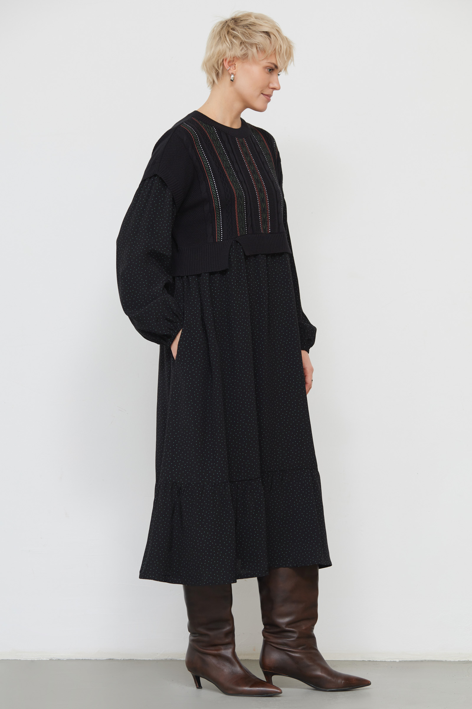 Комбинированное платье с рукавами и юбкой из струящейся вискозы в горошек, и имитацией жилета с фактурным орнаментом.