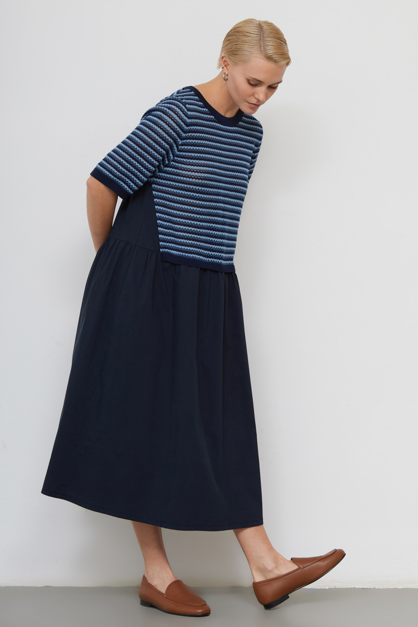 Комбинированное ярусное платье с вязаной частью сверху и текстильной юбкой.