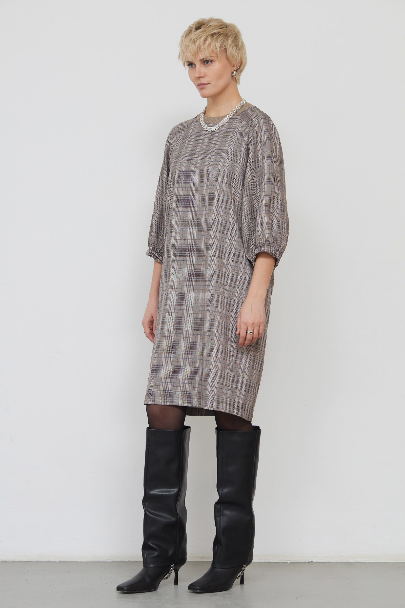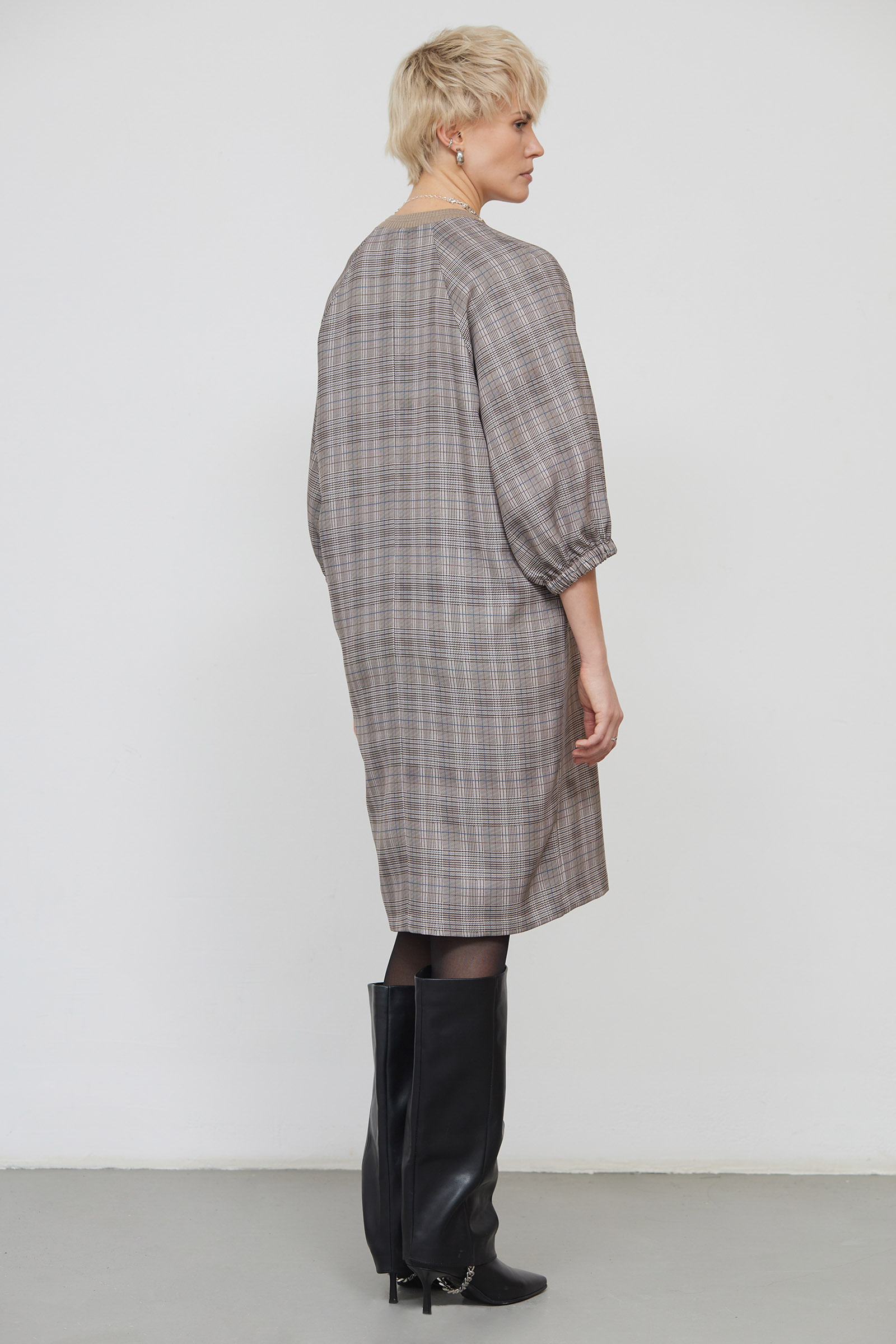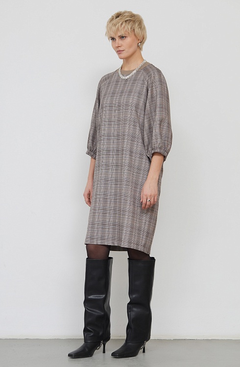Платье oversize в клетку с объемным рукавами.