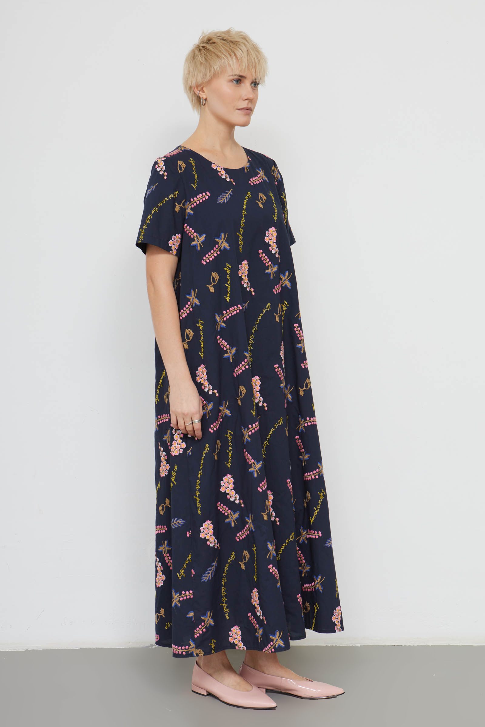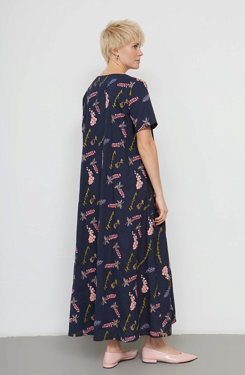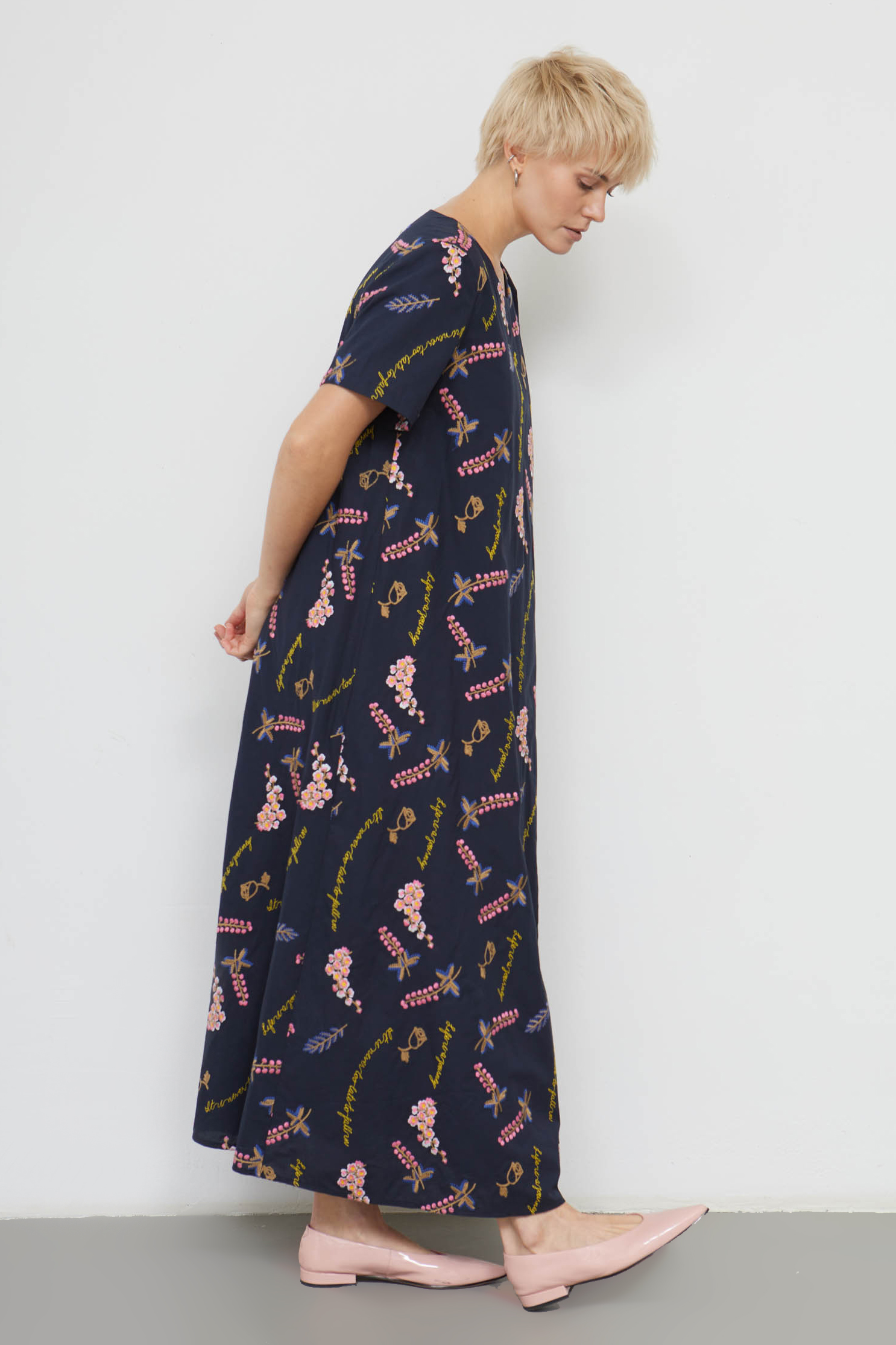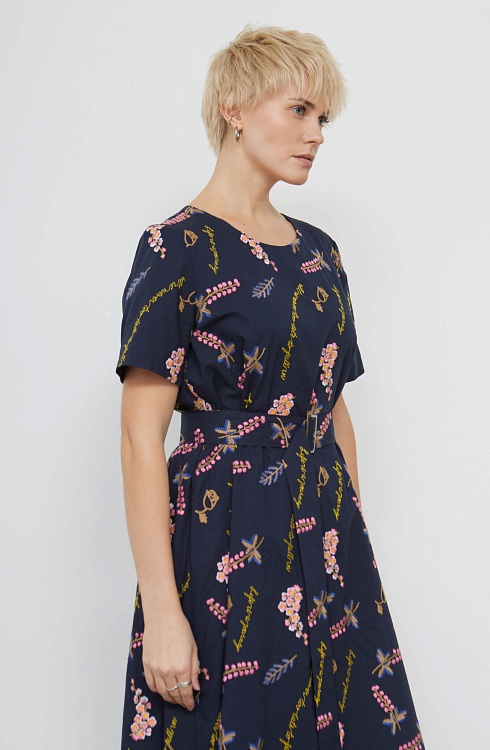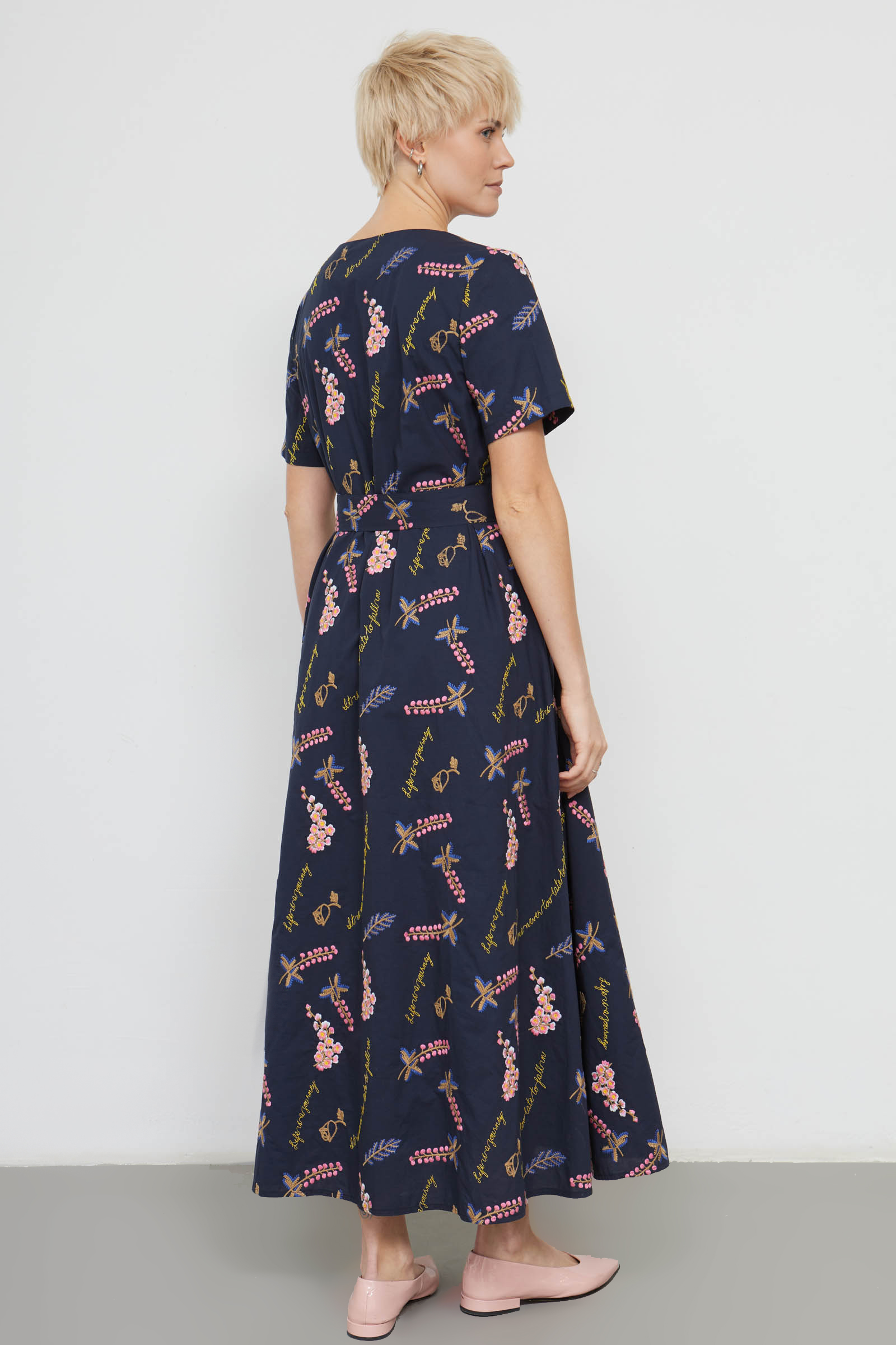 Длинное платье oversize из легкого хлопка с контрастной цветочной вышивкой и поясом.