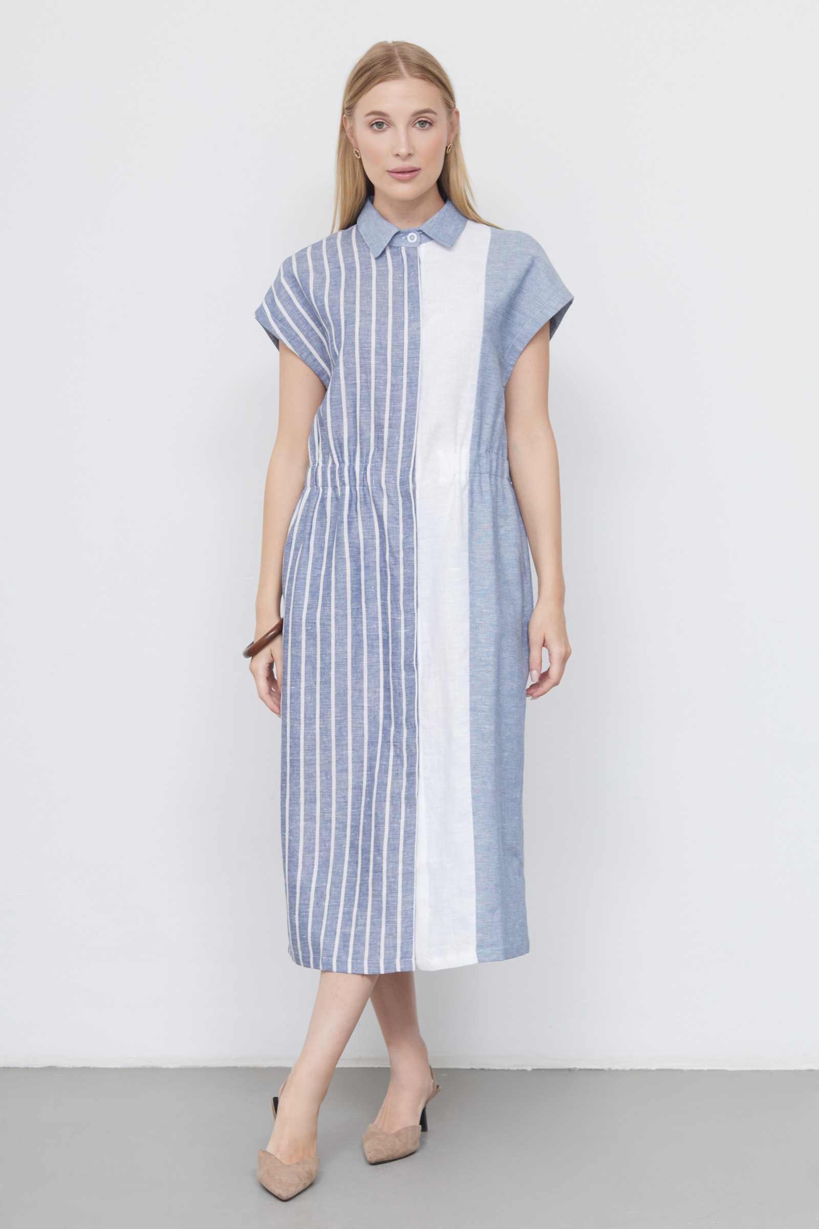 Платье миди изо льна и хлопка с контрастными полосками и супатной застежкой.