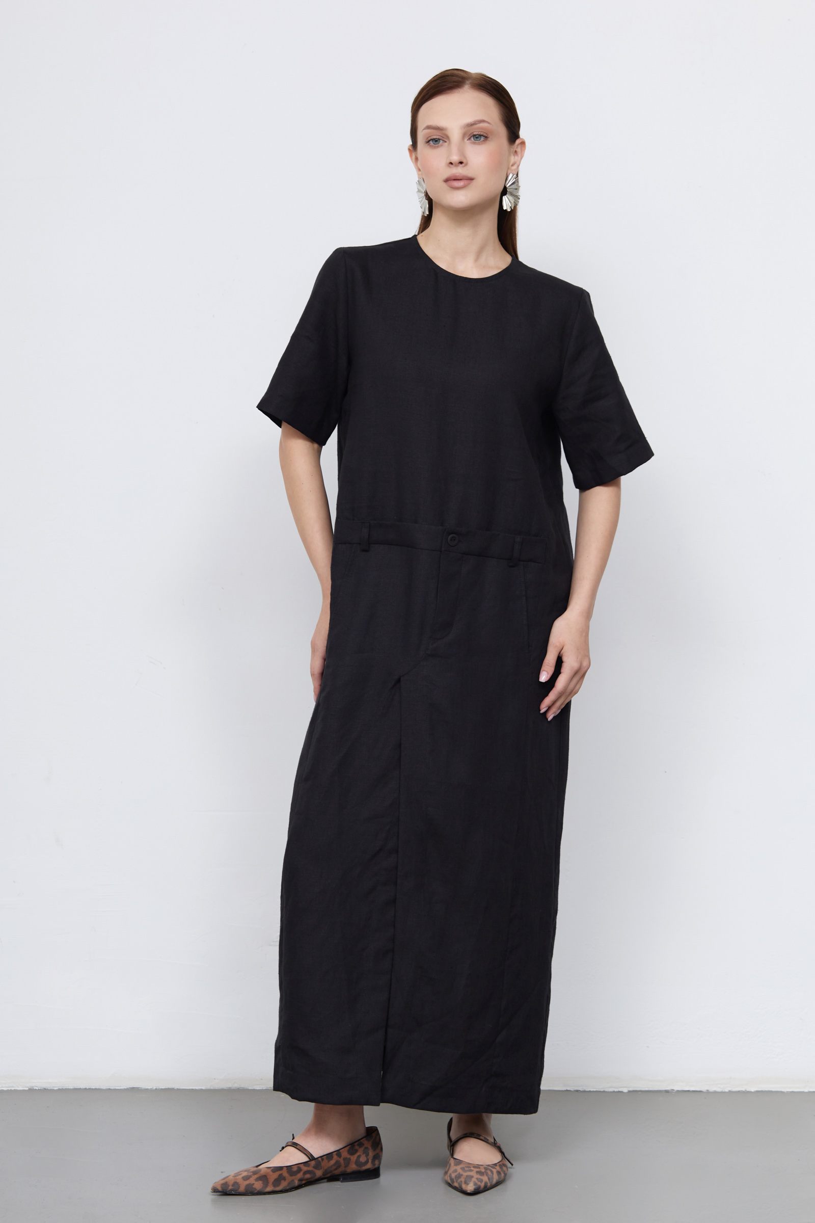 Длинное льняное платье oversize с имитацией пояса.