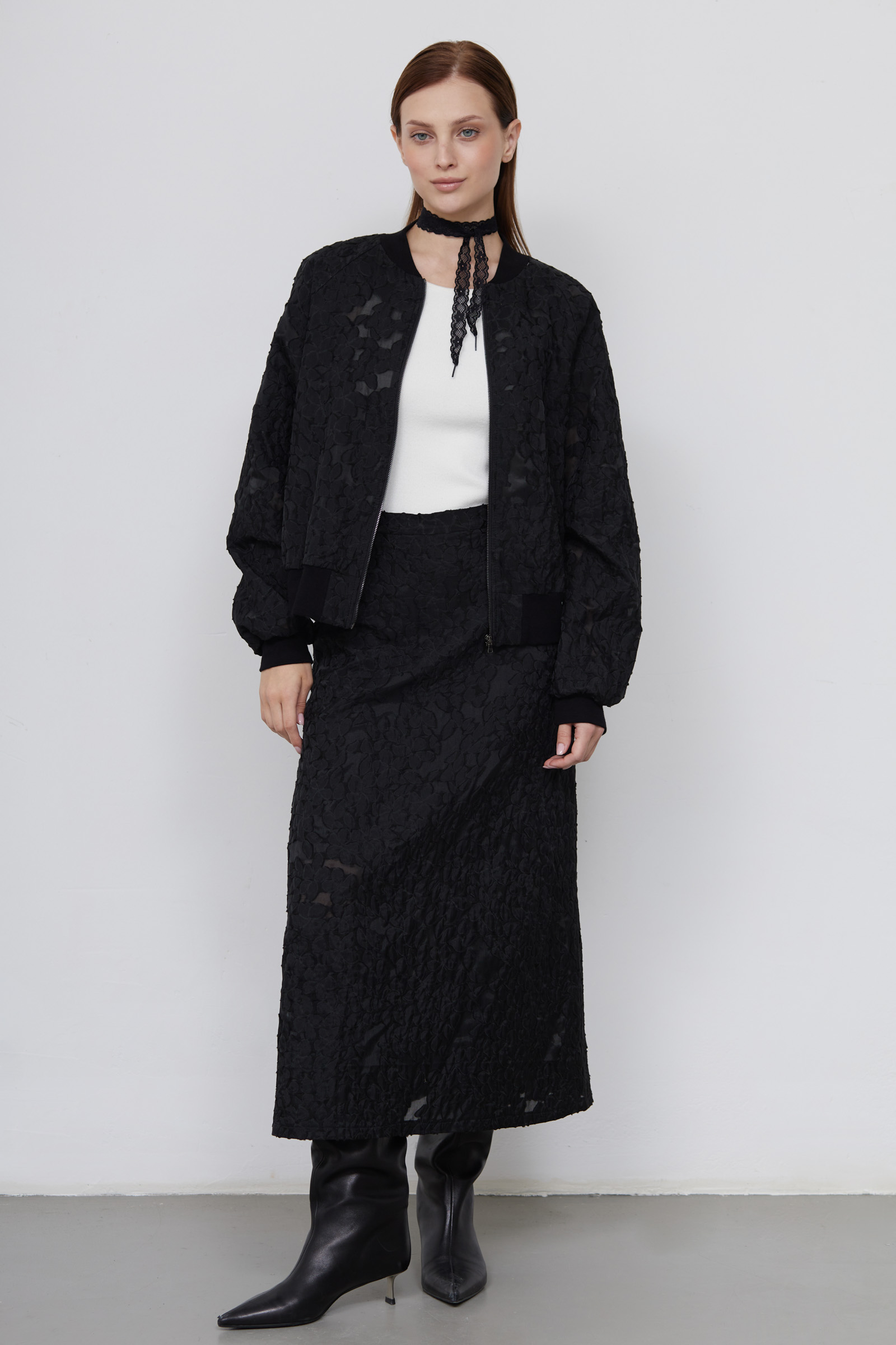 Юбка миди из органзы с цветочной аппликацией.