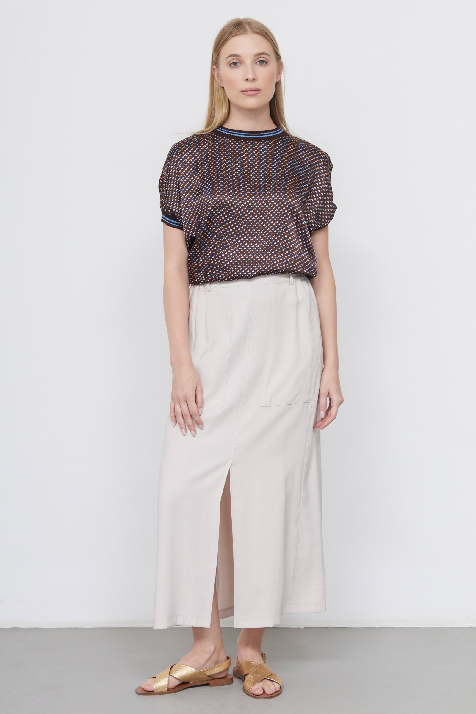 Юбка миди из вискозы с разрезом спереди.