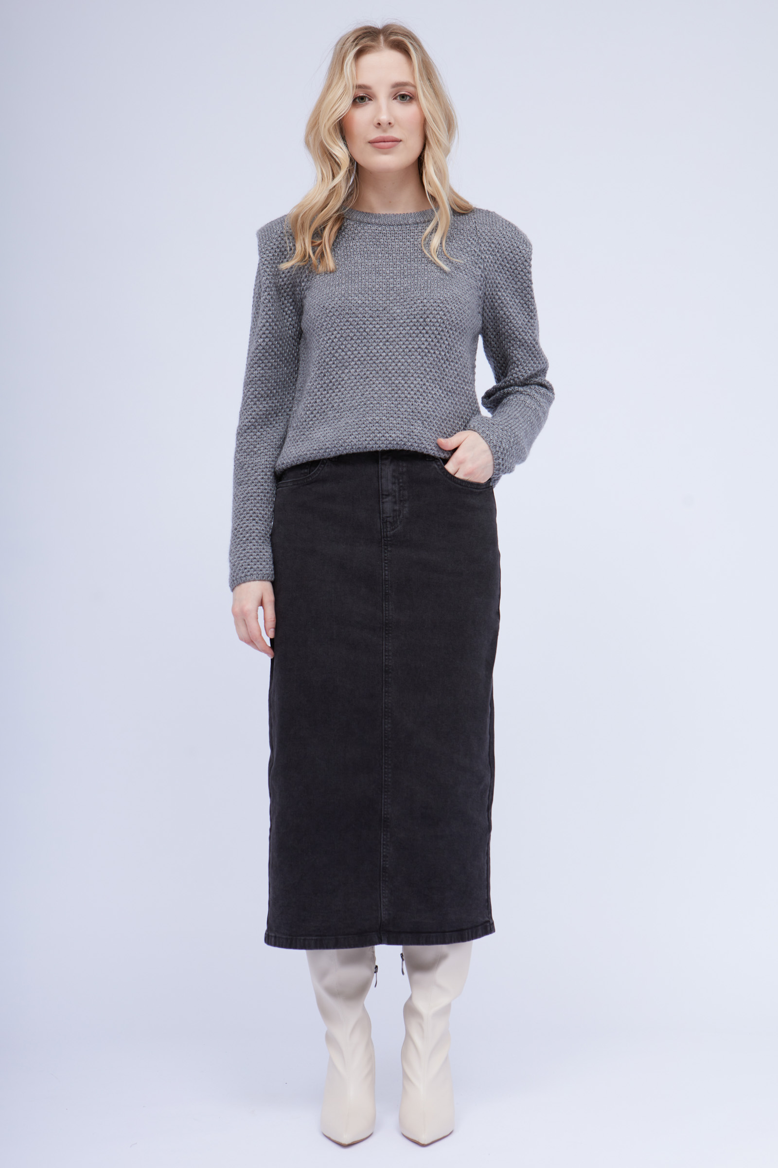 Джинсовая юбка миди с разрезом сзади.