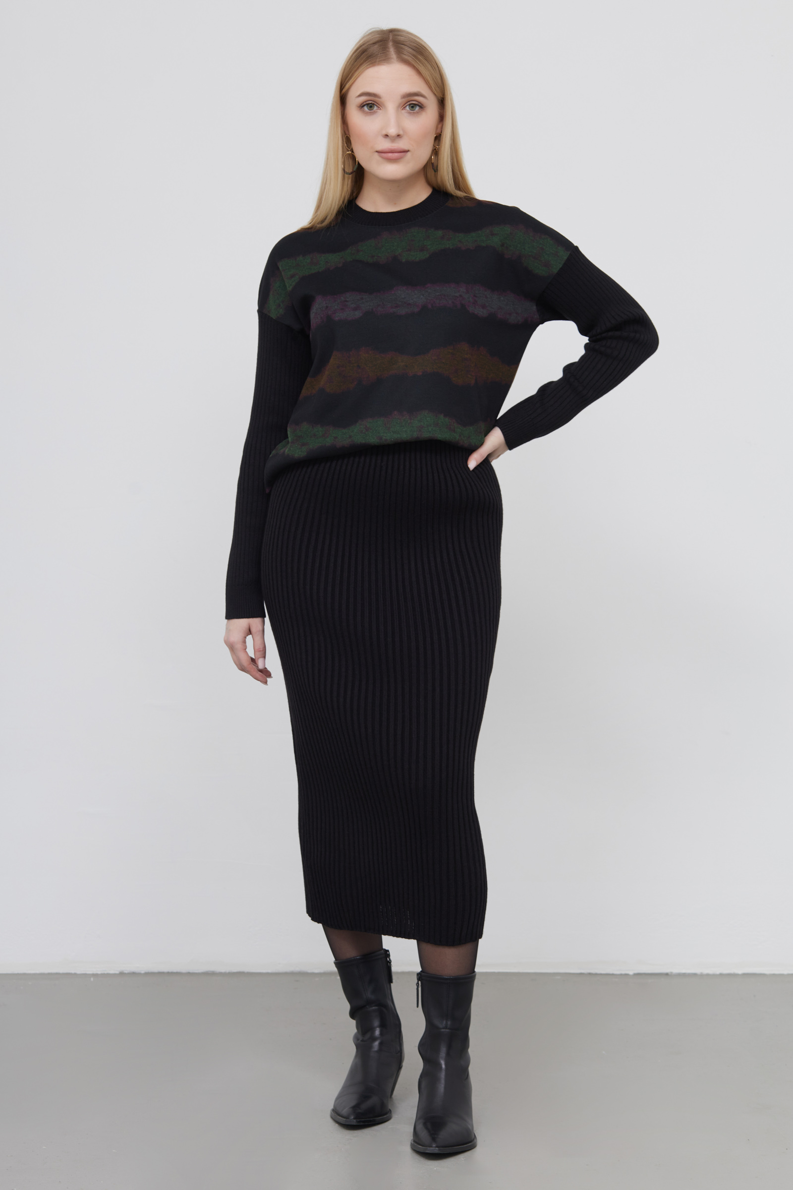 Юбка миди из вязаного трикотажа в рубчик.