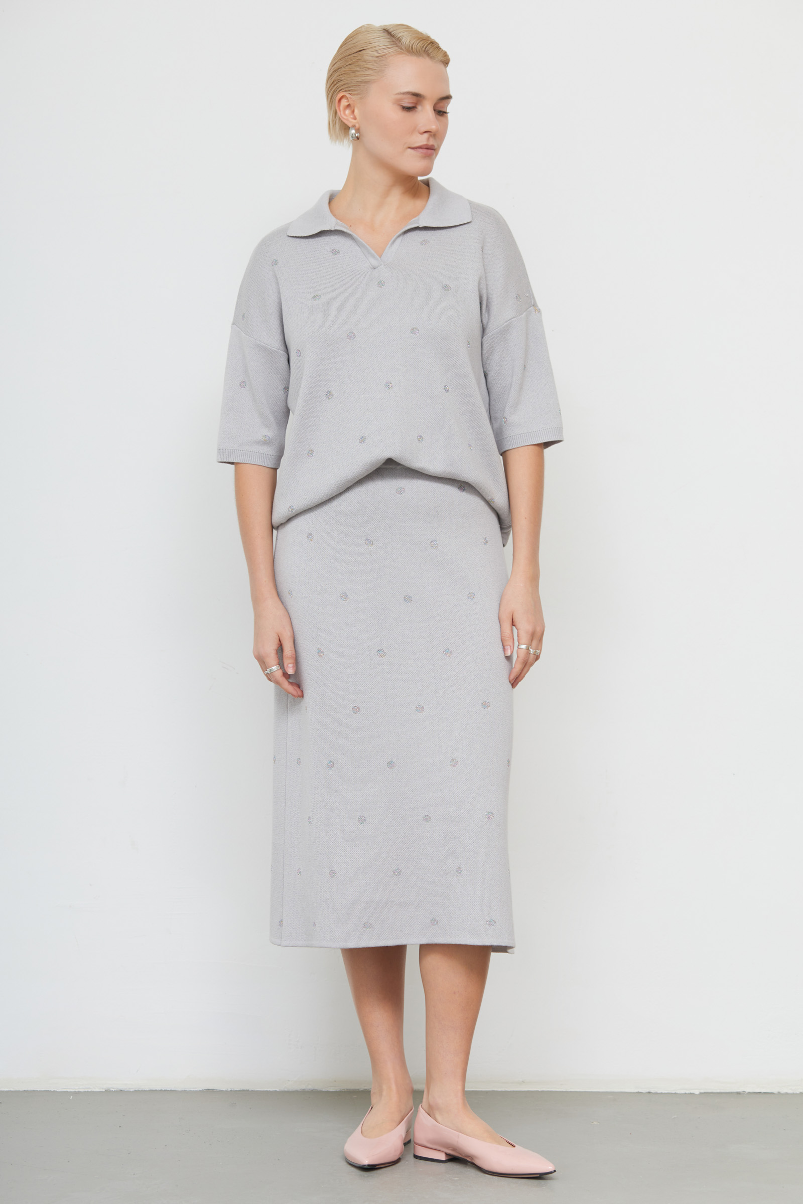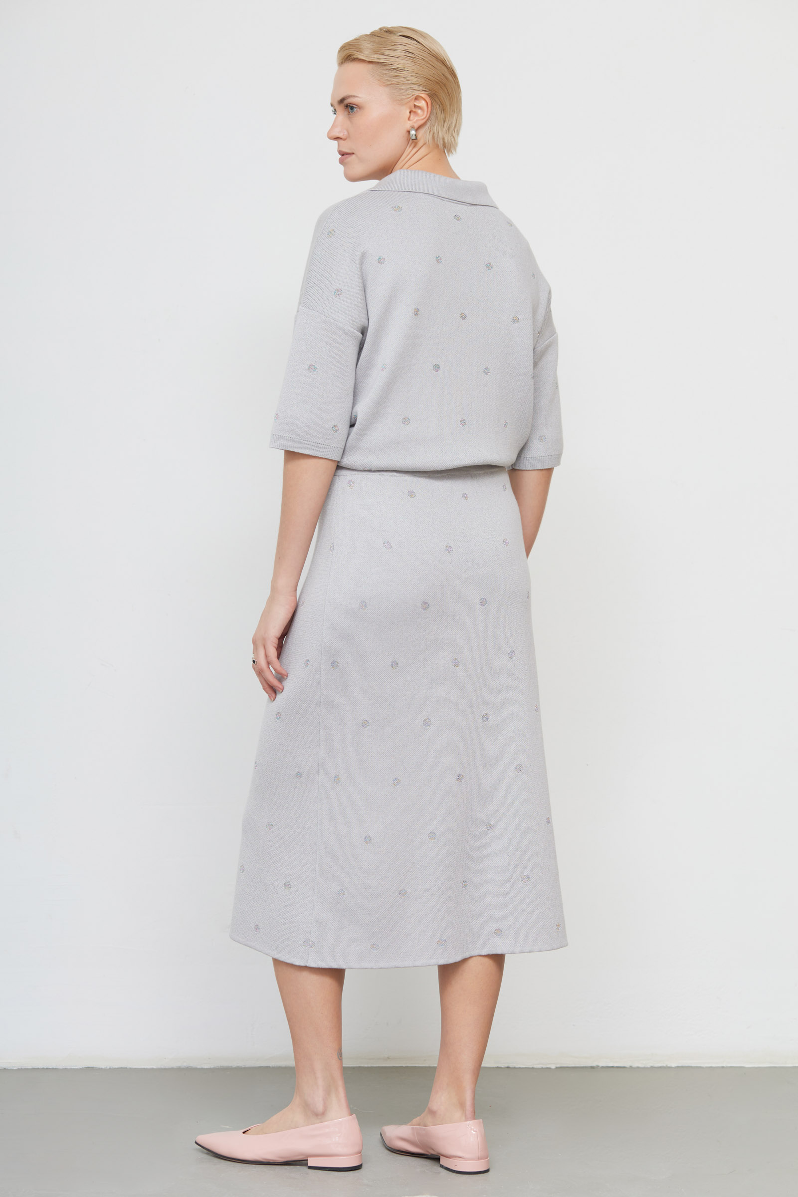 Юбка миди из мягкого вязаного трикотажа в горошек из люрекса.