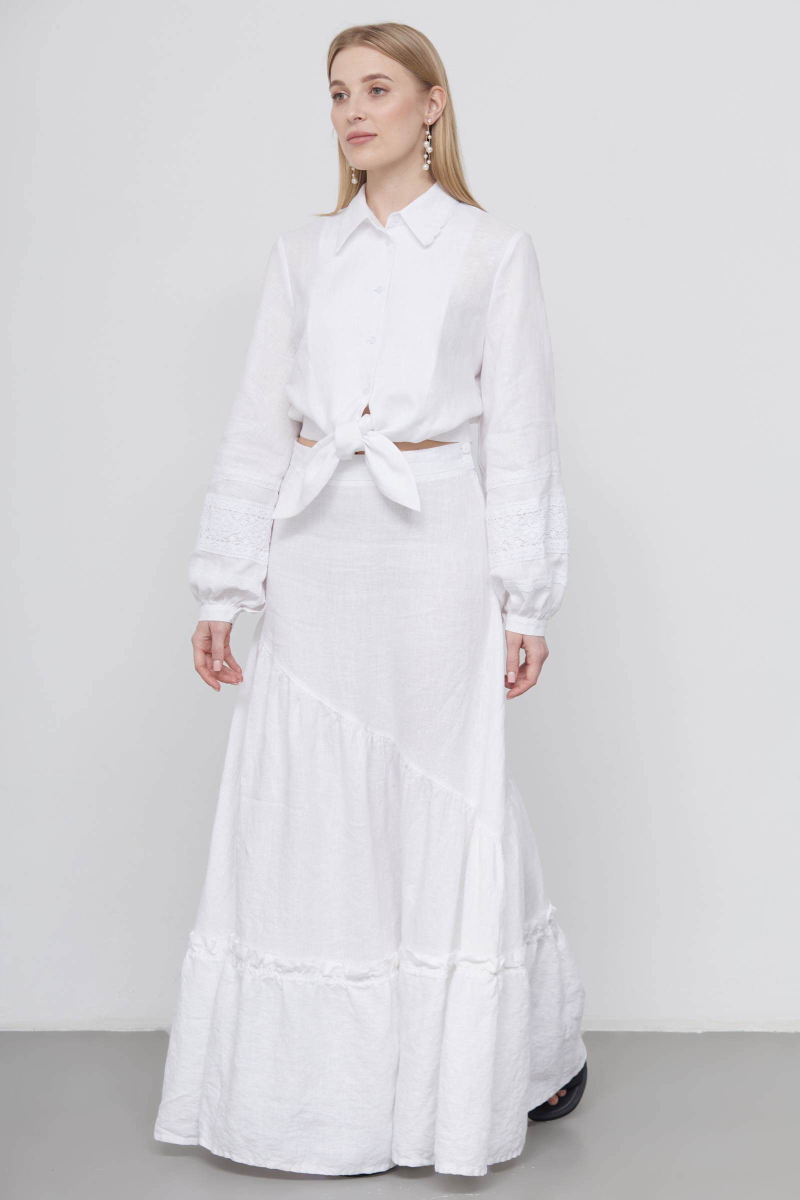 Длинная ярусная юбка изо льна с оборкой по низу.