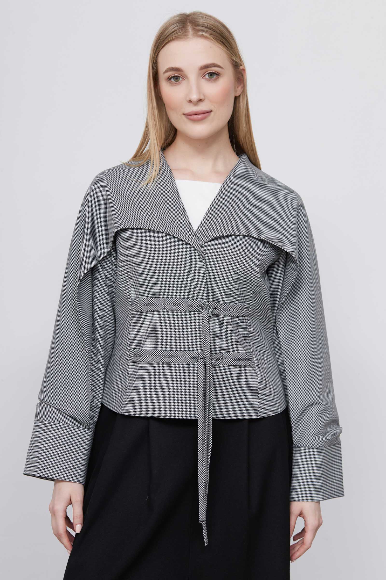 Жакет из поливискозы с принтом "пье-депуль", отлетной кокеткой и декоративными завязками.