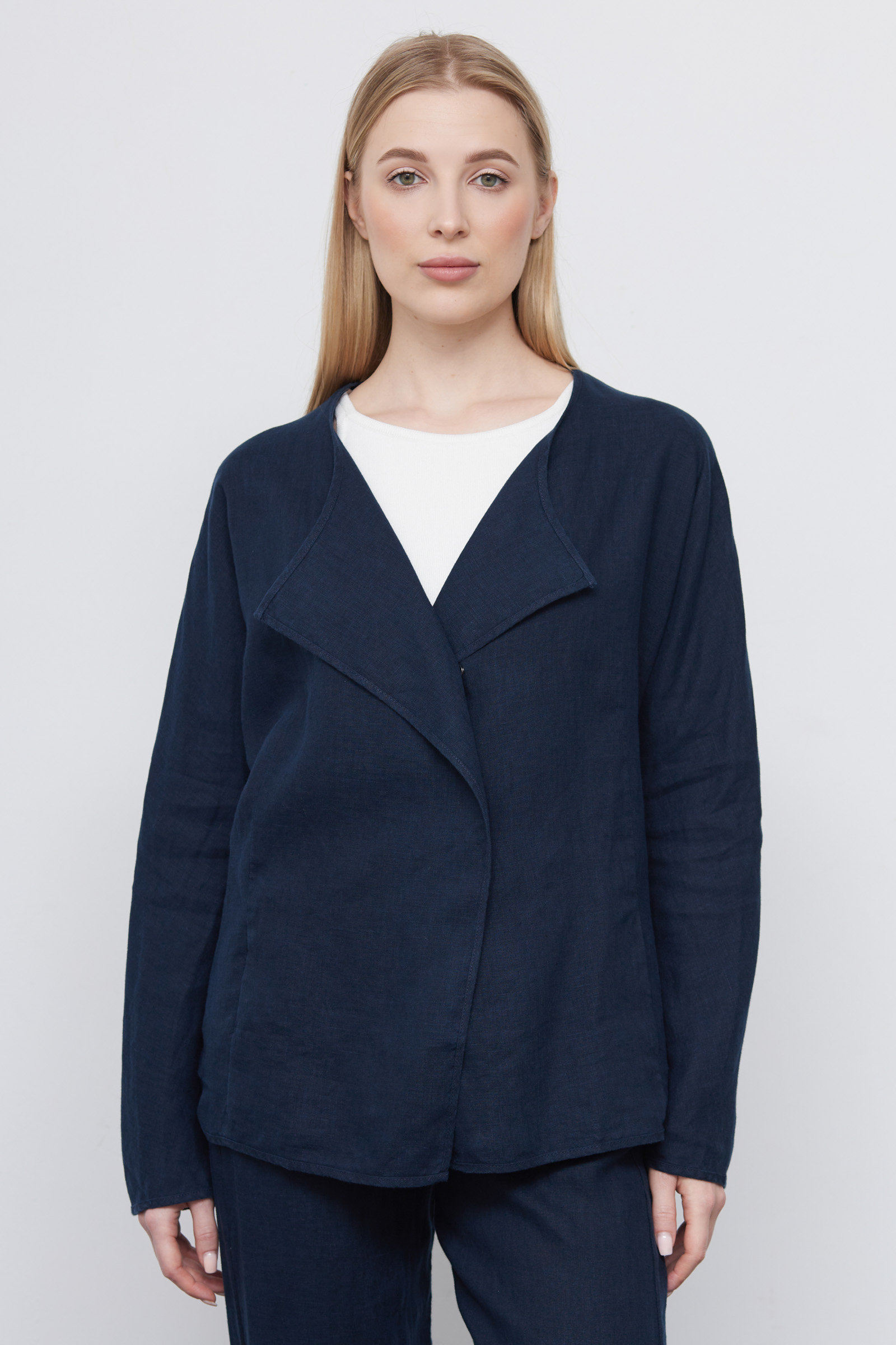 Льняной жакет на кнопках с цельнокроеными лацканами.