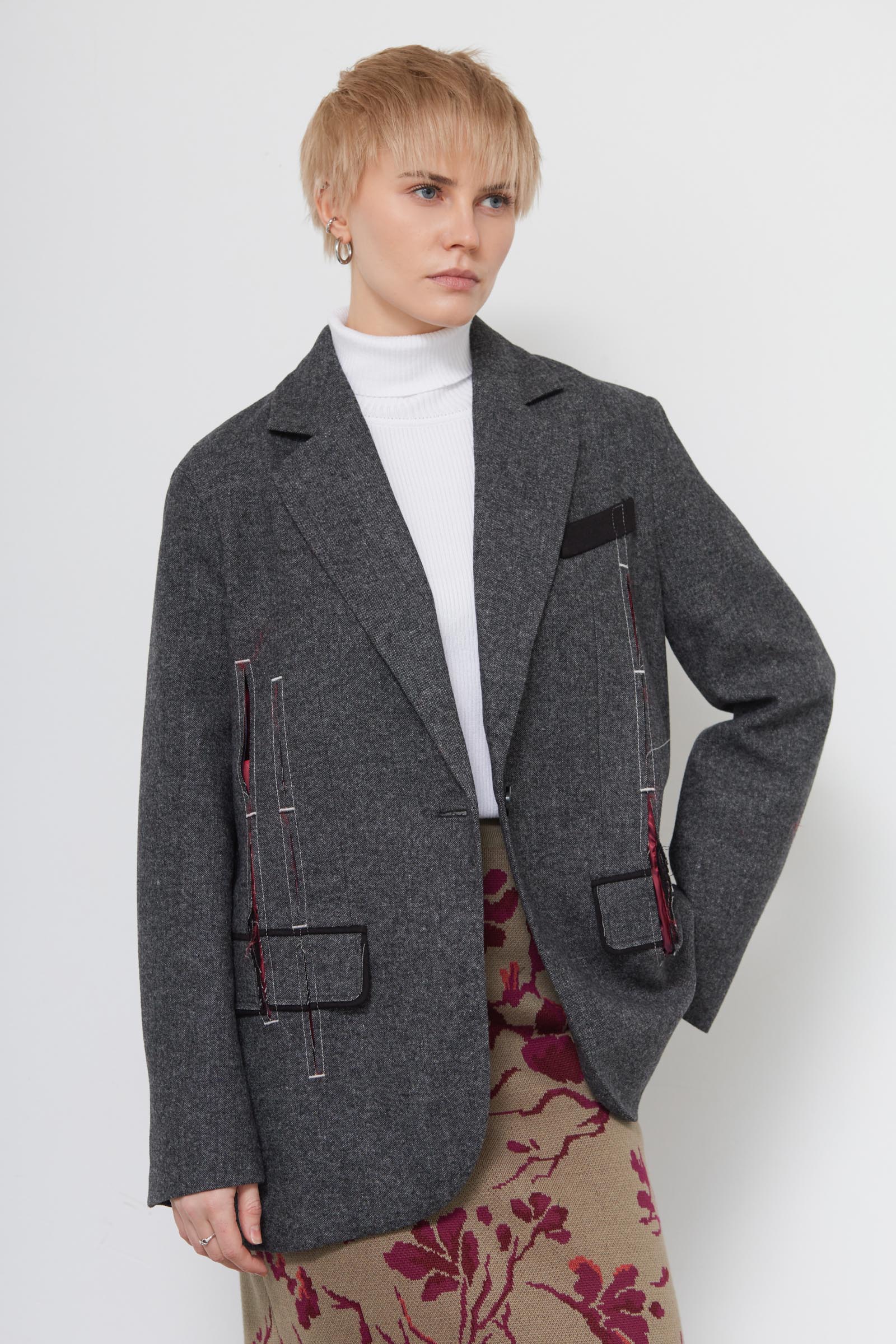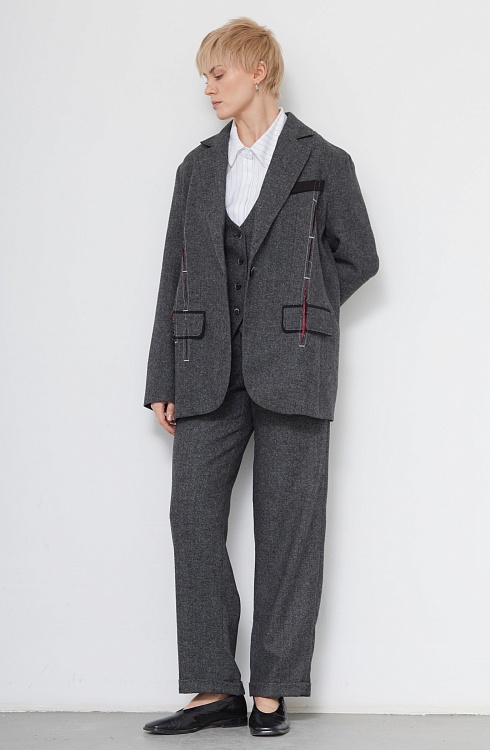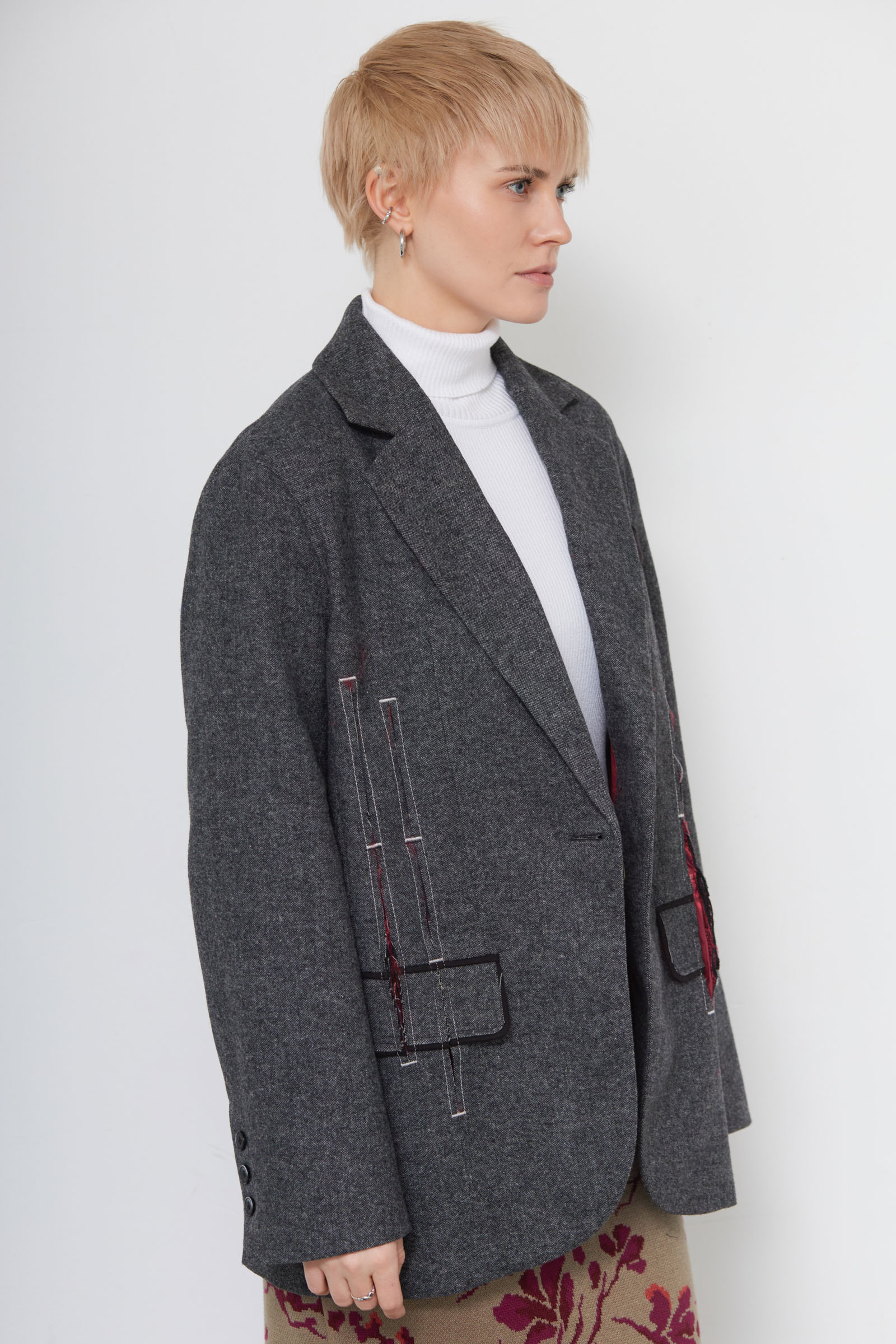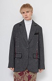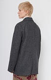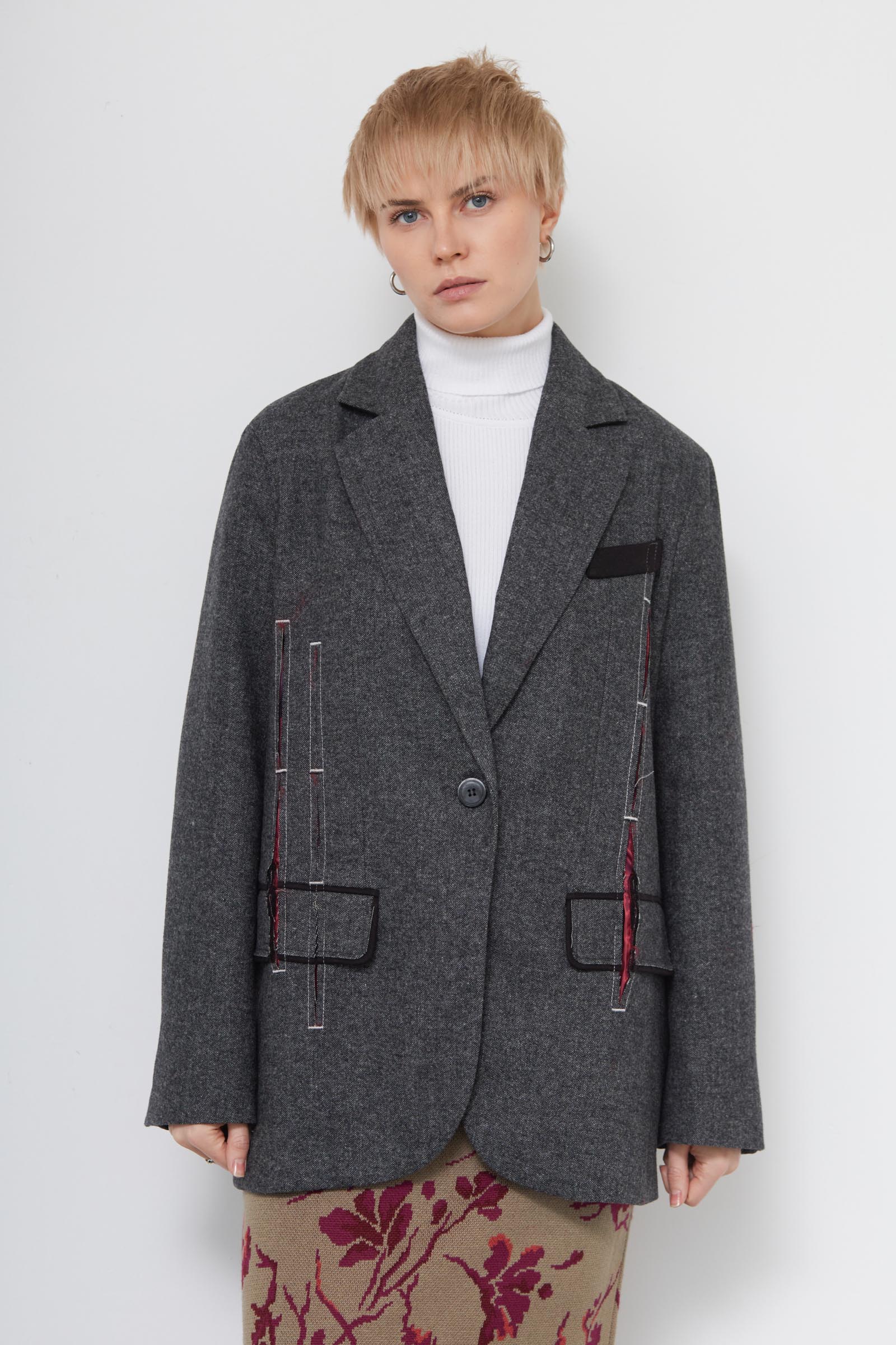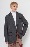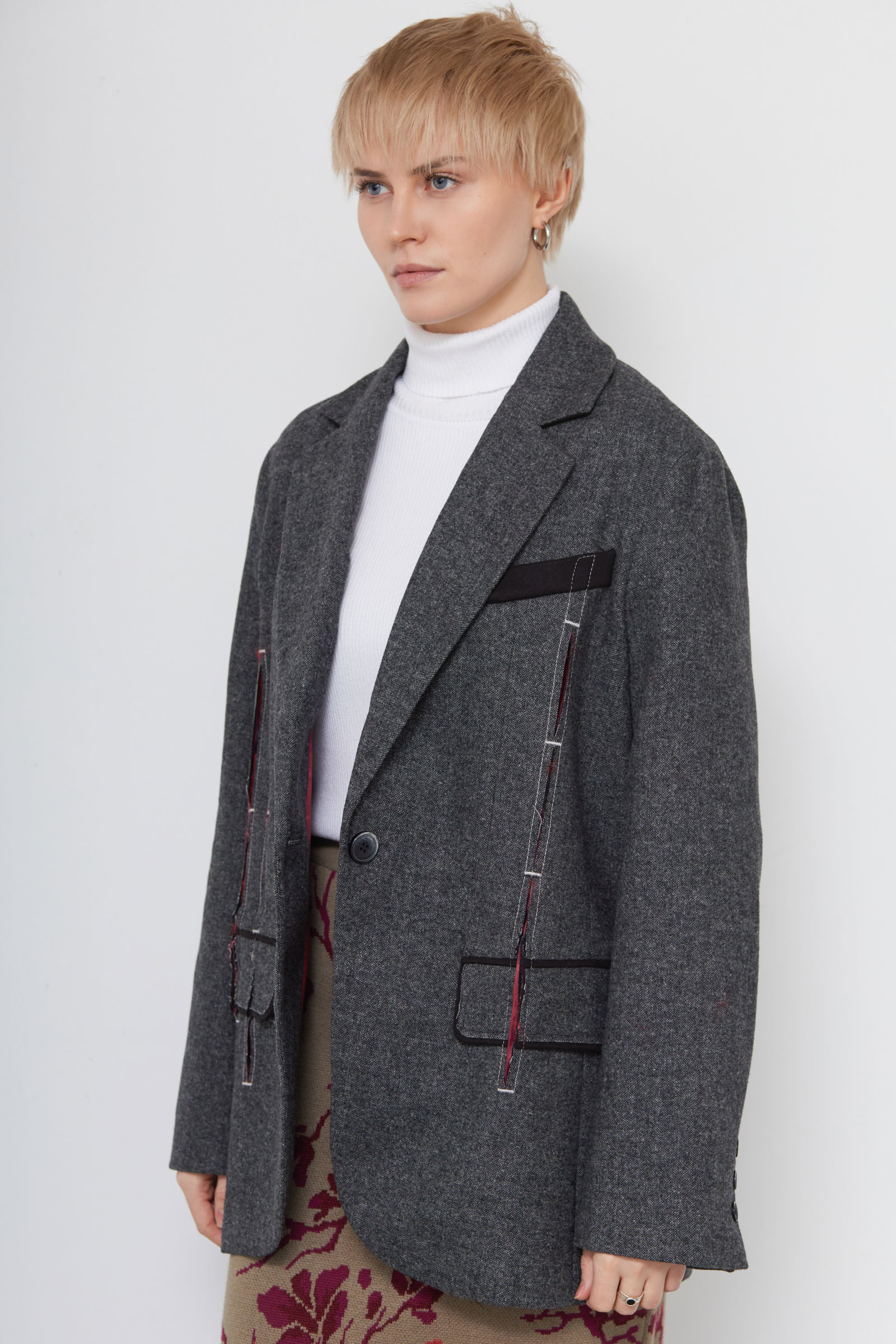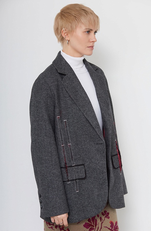 Жакет oversize из меланжевой костюмной ткани с декоративными разрезами и ложными карманами.