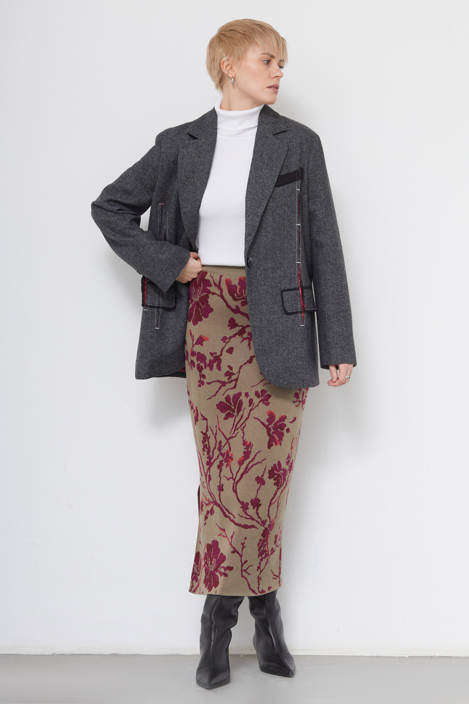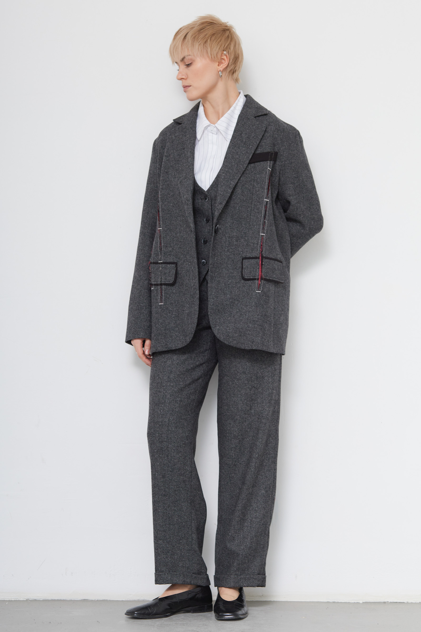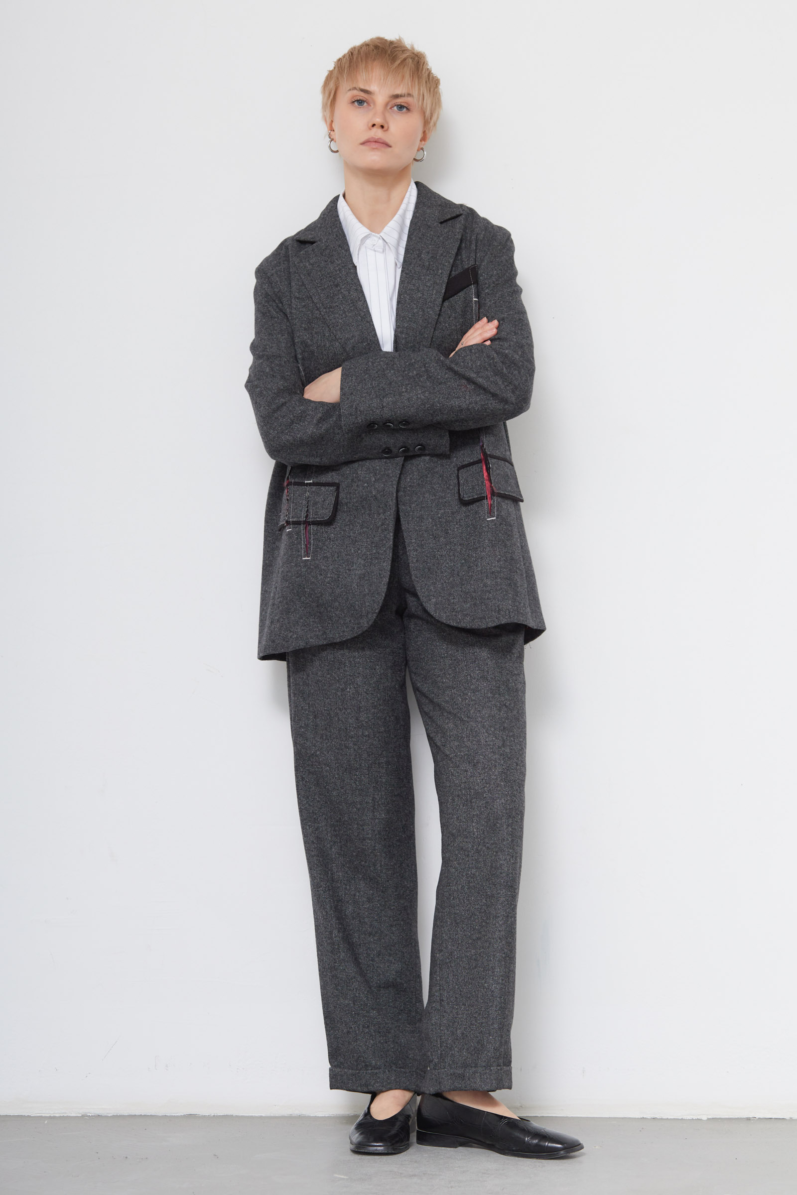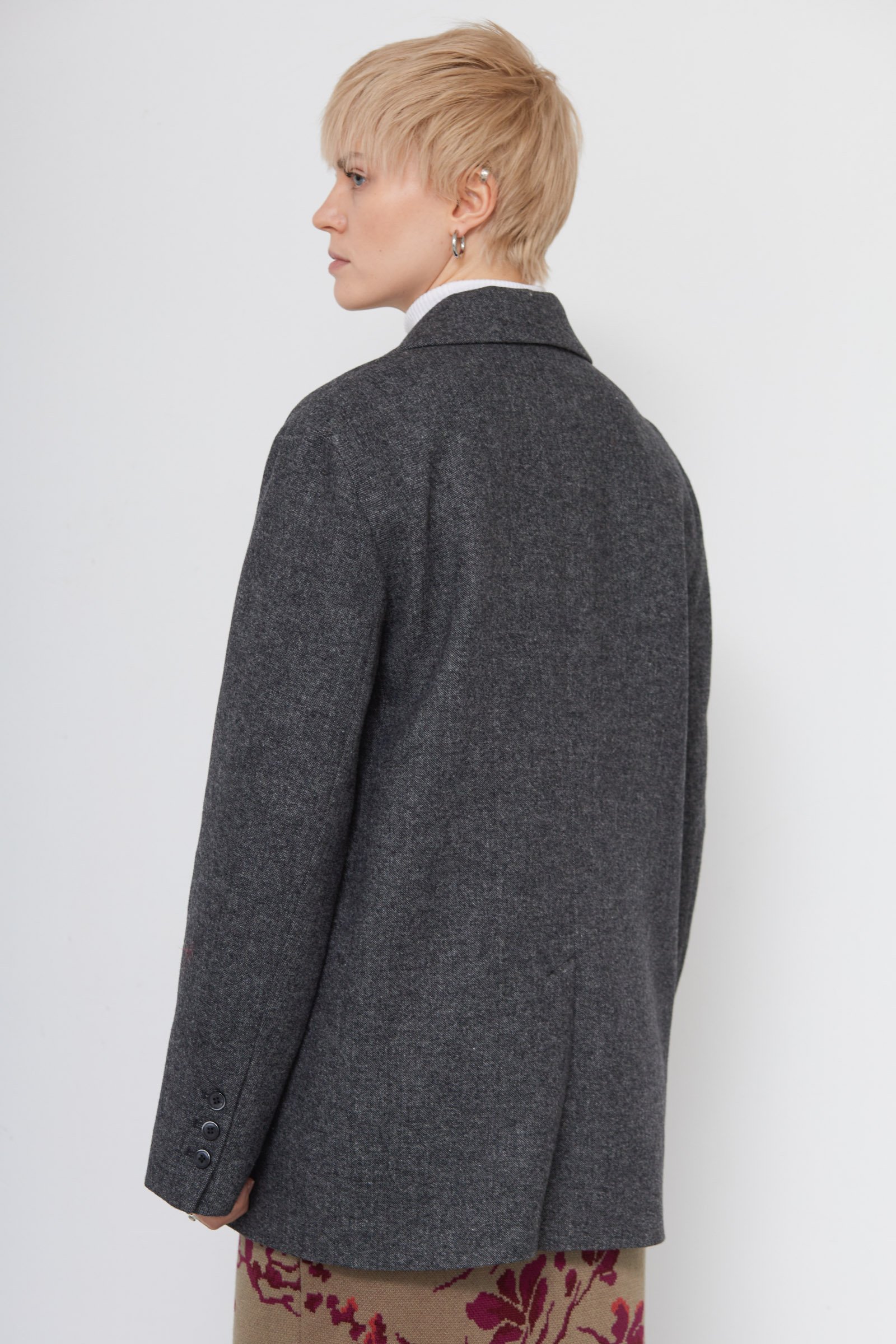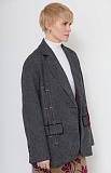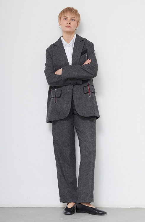 Жакет oversize из меланжевой костюмной ткани с декоративными разрезами и ложными карманами.