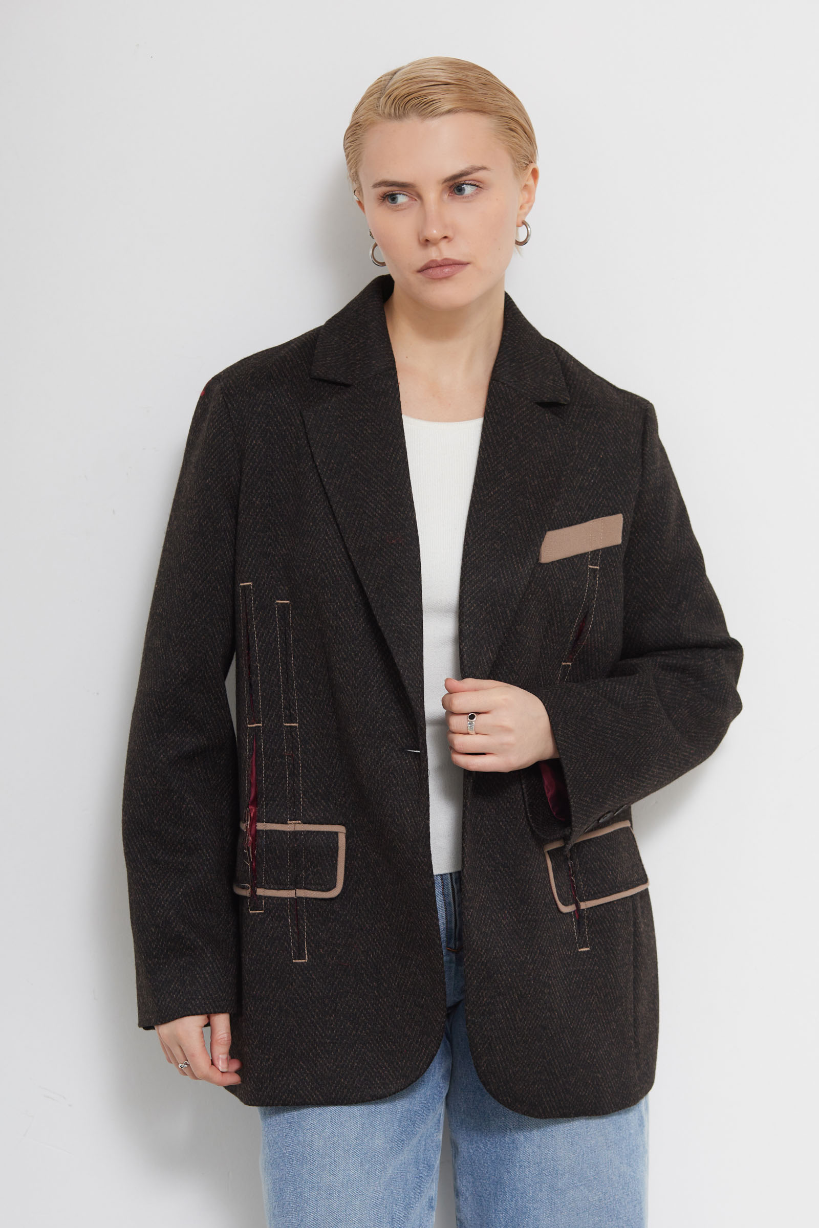 Жакет oversize из меланжевой костюмной ткани в елочку с декоративными разрезами и ложными карманами.