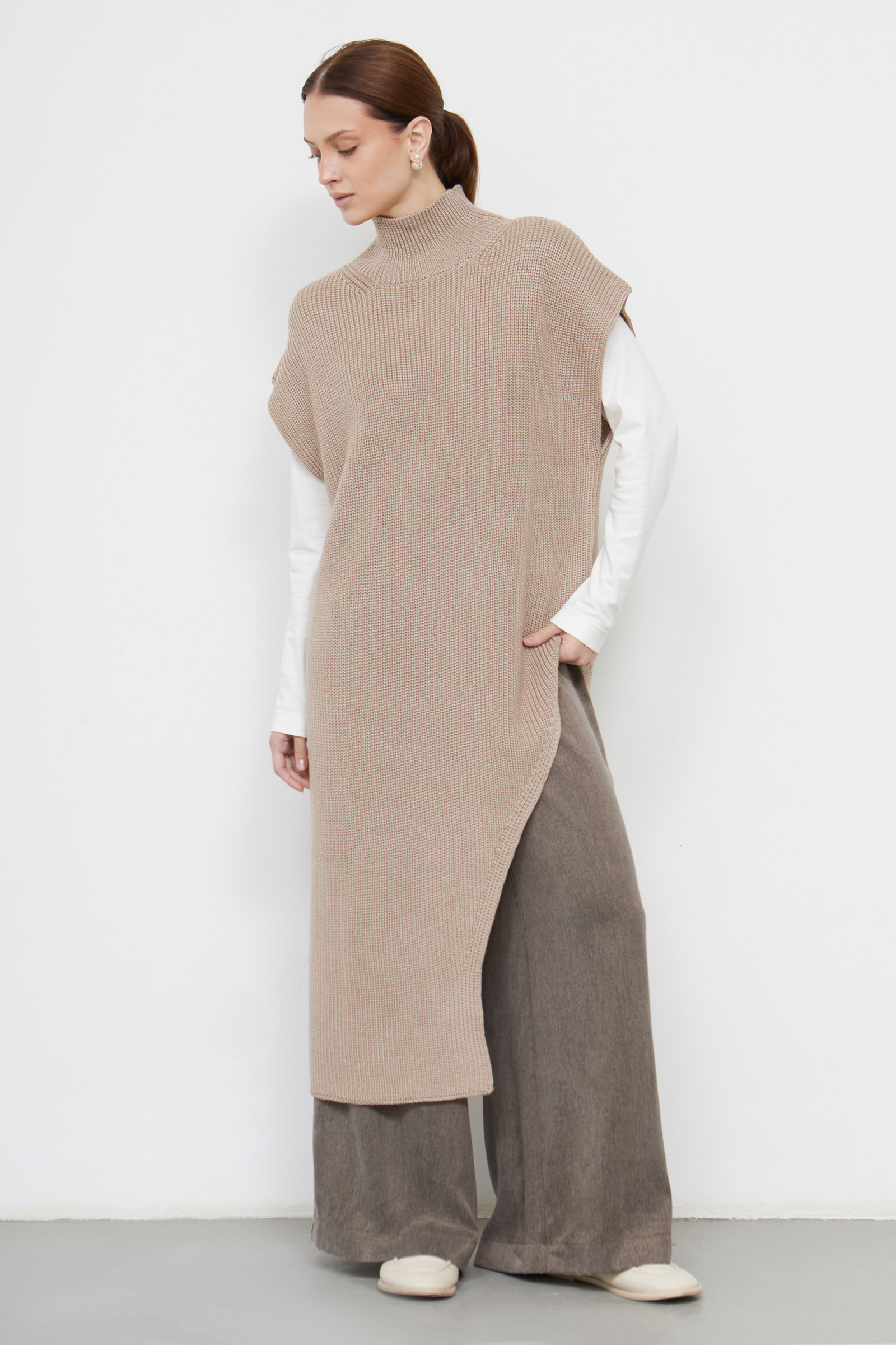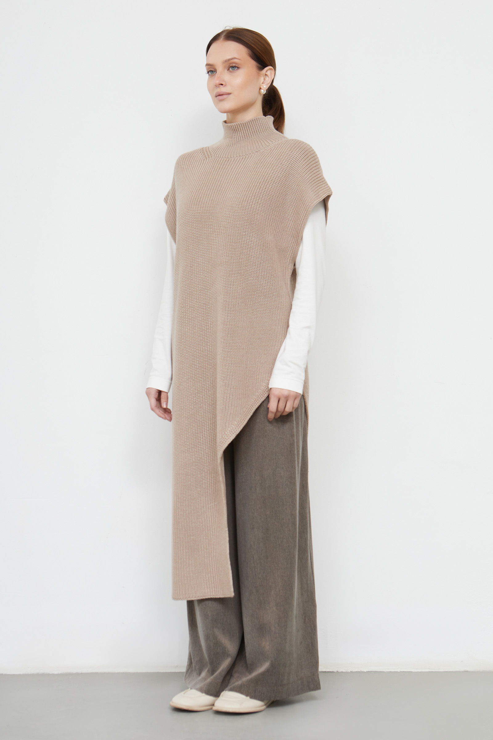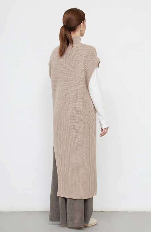 Длинный жилет из мягкого вязаного трикотажа с шерстью и асимметричным вырезом сбоку.