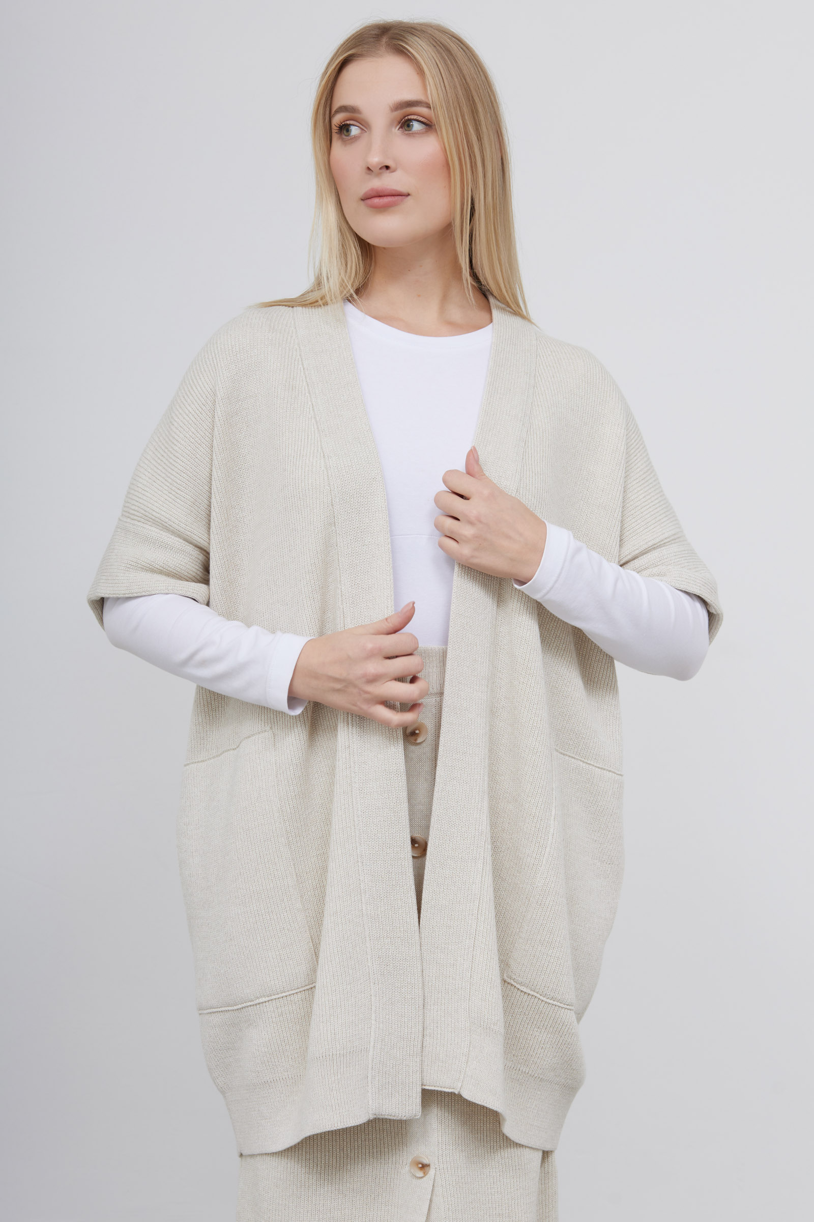 Длинный жилет из вязаного полушерстяного трикотажа.