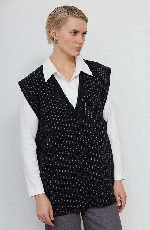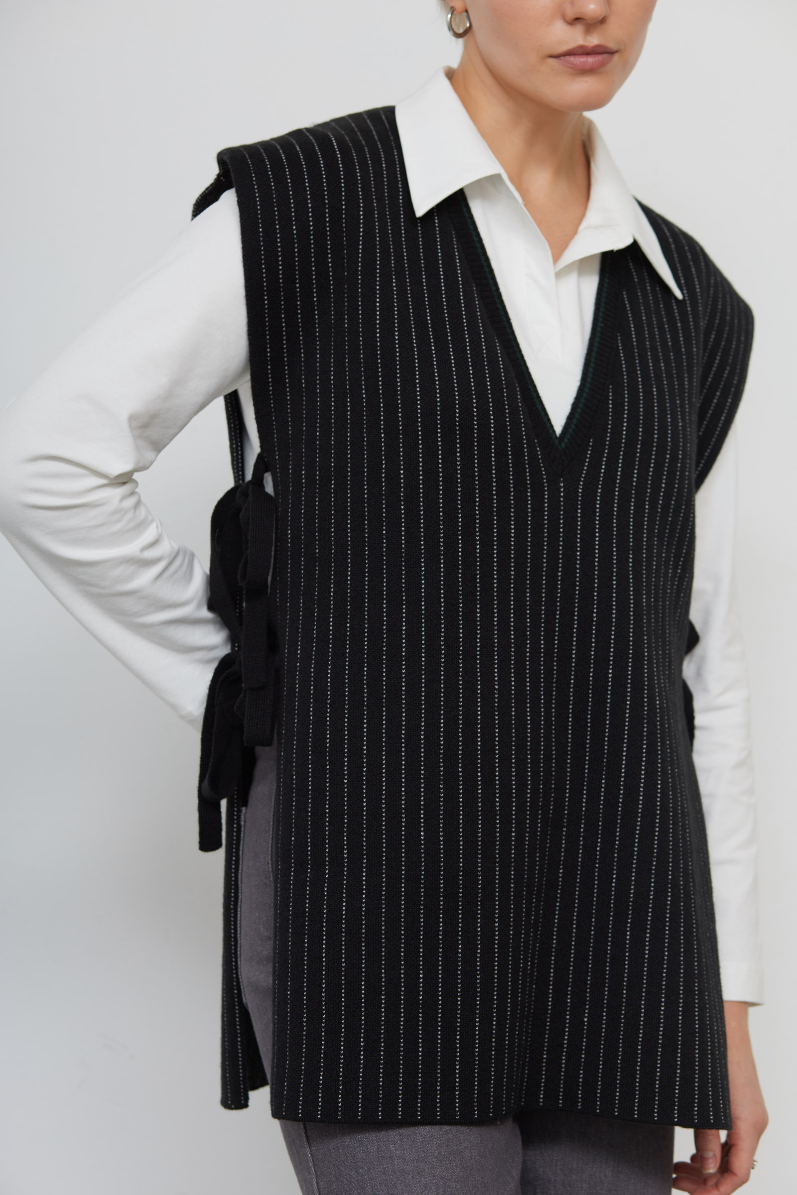 Удлиненный жилет oversize жаккардовой вязки в полоску с завязками по бокам.
