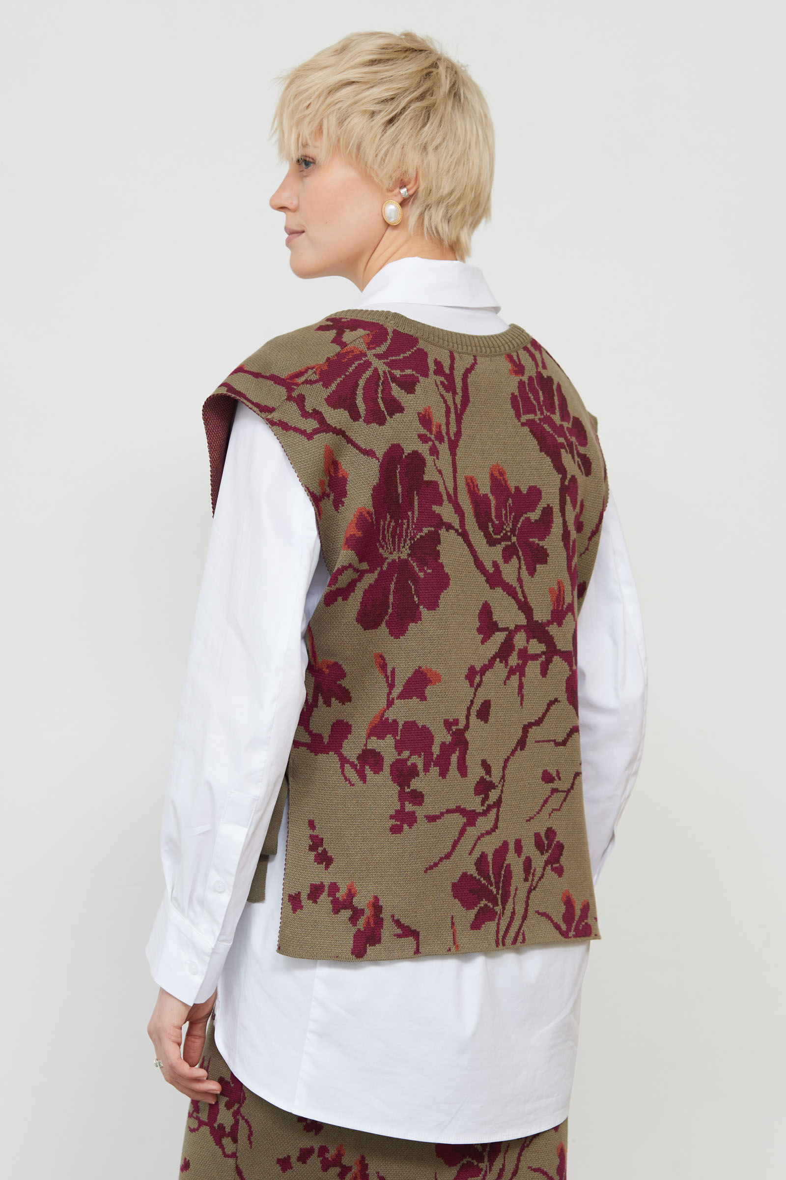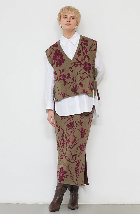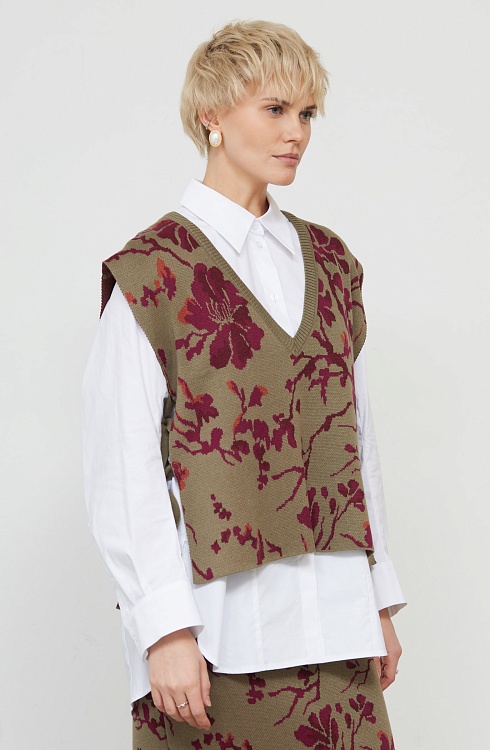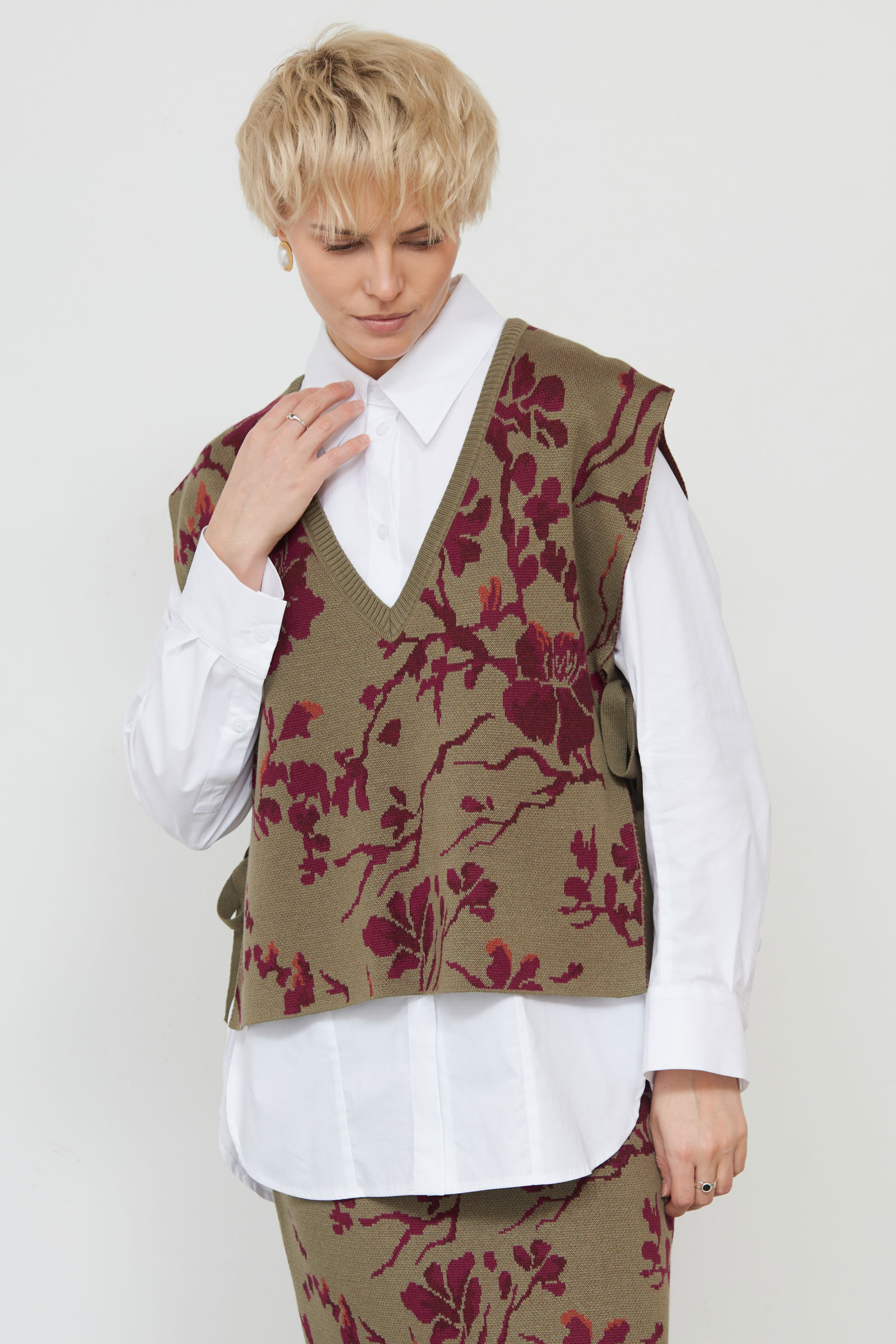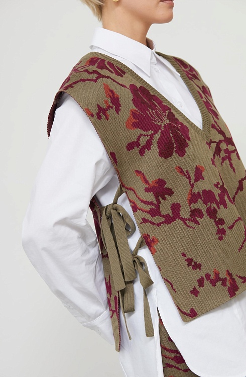 Жилет oversize из мягкого трикотажа жаккардовой вязки с завязками по бокам.